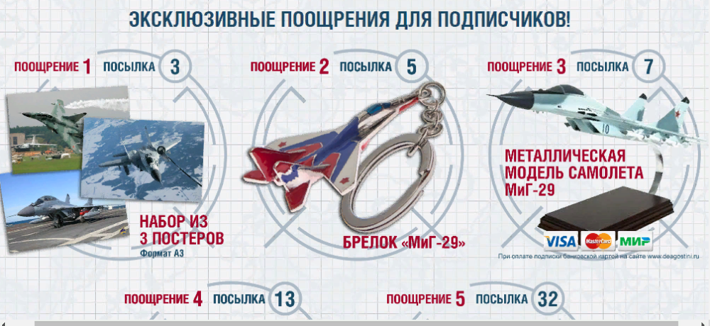 В случае выбора премиального предложения с выпусков 1, 2, 4, 7 Подписчик будет оплачивать дополнительно 59 рублей за каждый выпуск, начиная с выпуска № 7 и получит дополнительные поощрения - 5 моделей самолетов с выпусками 38, 54, 70, 86, 110.