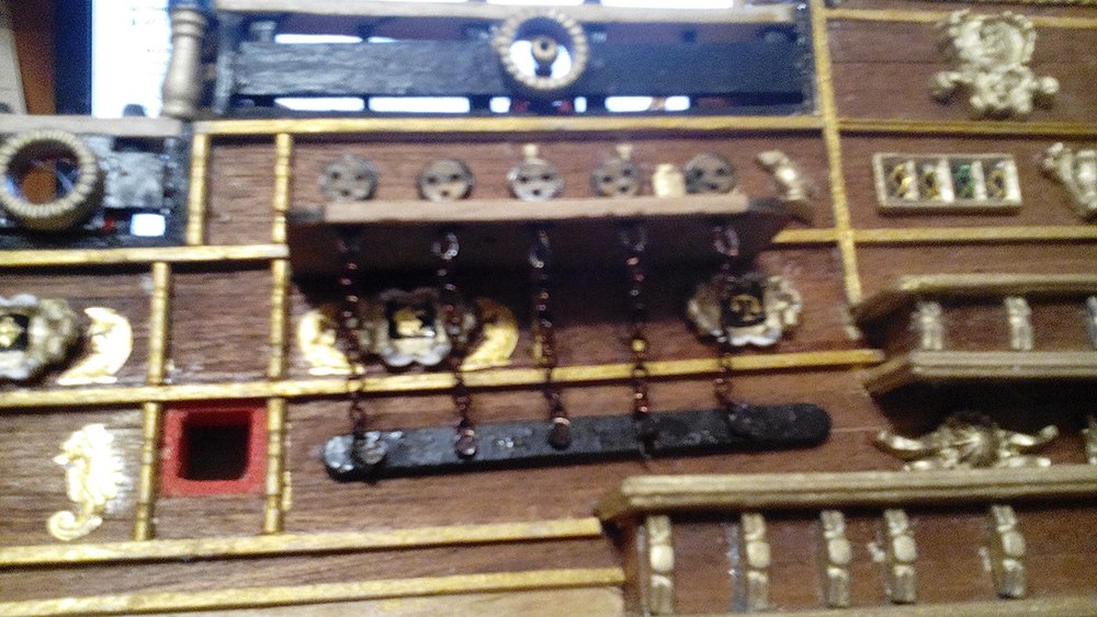 Видно что внесли свои индивидуальные нотки, и это украшает копию. Только я не понял, объясните пожайлуста что за украшения на средней палубе между пушечными портами квадраты с кругами? На юте вы поставили световую решетку