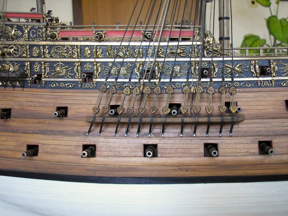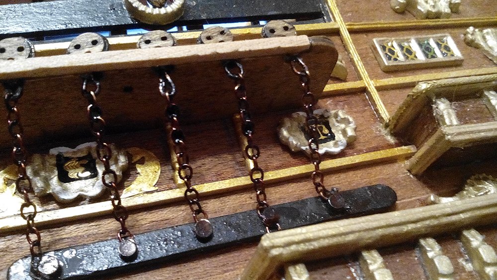 Видно что внесли свои индивидуальные нотки, и это украшает копию. Только я не понял, объясните пожайлуста что за украшения на средней палубе между пушечными портами квадраты с кругами? На юте вы поставили световую решетку