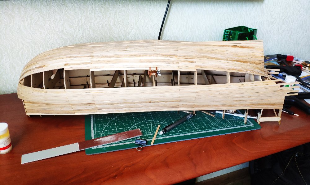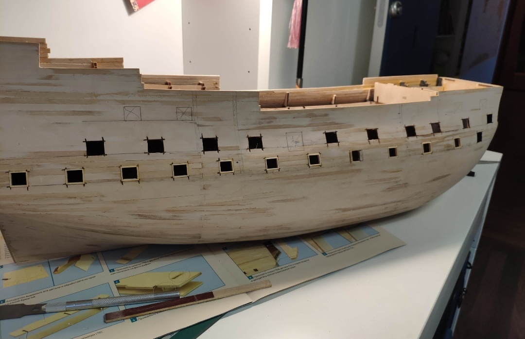 На данный момент корпус собран, дошёл до этапа шпаклёвки и разметки пушечных портов.
