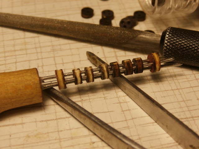 Работу с "кошками" в принципе я закончил. Отработал технологию обтачивания, пропитки секундным клеем, покраски и лакировки фанерных юферсов патворка. Разрешите не много остановлюсь на своем отношении к фанерным деталям модели. Конечно отрицательное. Фанера очень рыхлый, по структуре материал. Мелкие детали вырезанные из фанеры физически слабы. Все это так и если есть возможность надежней выписать из интернет магазинов юферсы и блоки изготовленные из цельной древесины или изготовить их самостоятельно. Действительным украшением исторической парусной модели несомненно является рангоут, стоячий и бегучий такелаж корабля. Чем более развит такелаж модели, чем гуще паутина снастей тем больше она интересна для зрителей! Итог единственный - нужно как можно больше блоков юферсов и т.д. И на общем фоне во второстепенных местах такелажа можно вполне воспользоваться фанерными "произведениями" ДеА. Предварительно пропитав фанерные детали клеем, чем значительно укрепив их физически. В итоге это конечно положительно скажется на общем бюджете модели. Я думаю, что многие коллеги не будут останавливаться на Повелителе, а поэтому не израсходованные фанерные юферсы в этой модели перейдут к следующей модели. По крайней мере глупо выбрасывать матрицы если возможно в будущем они пригодятся.