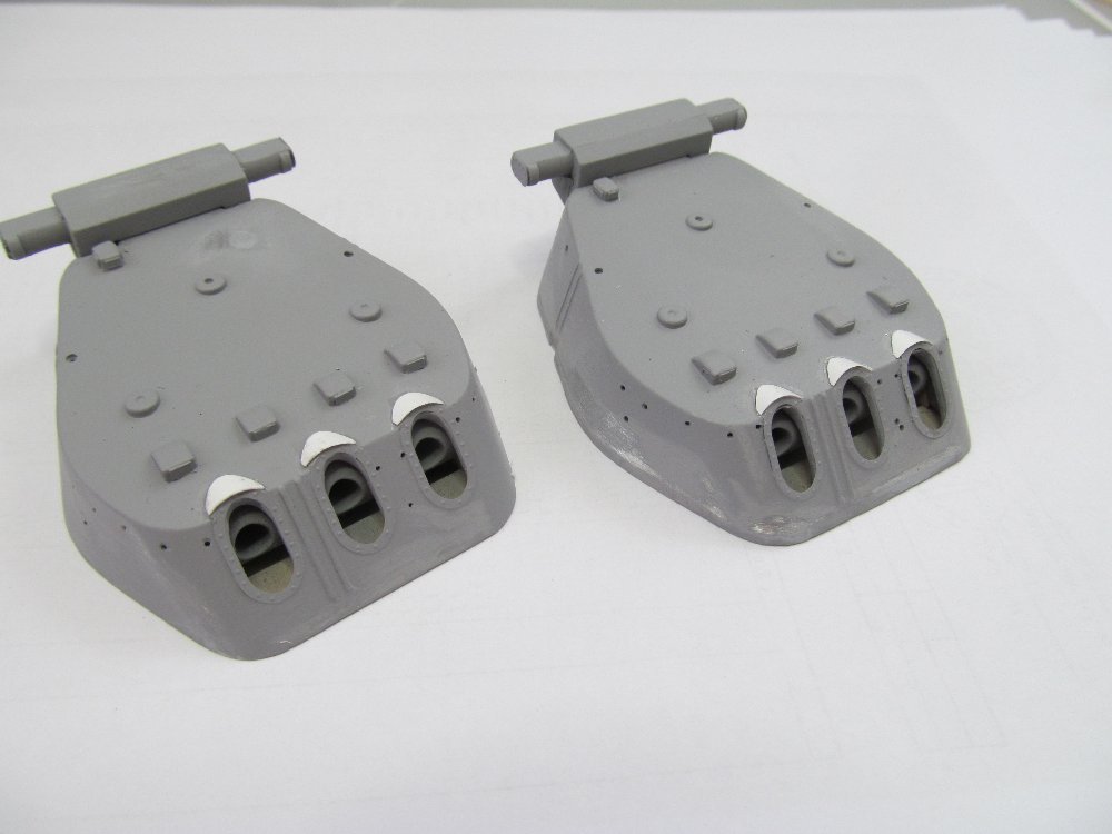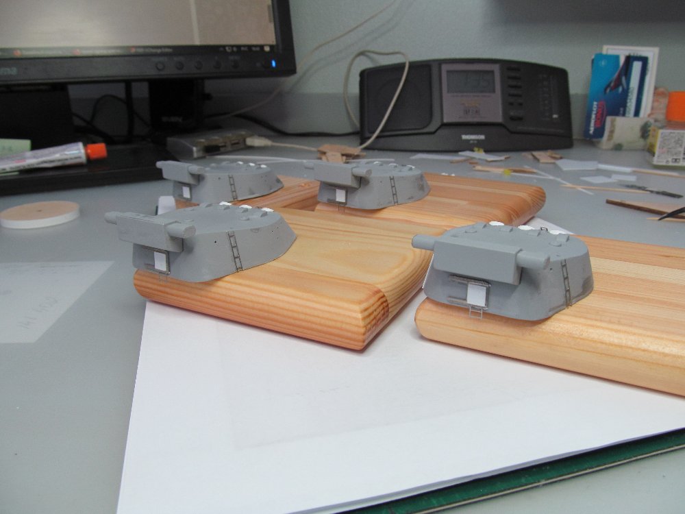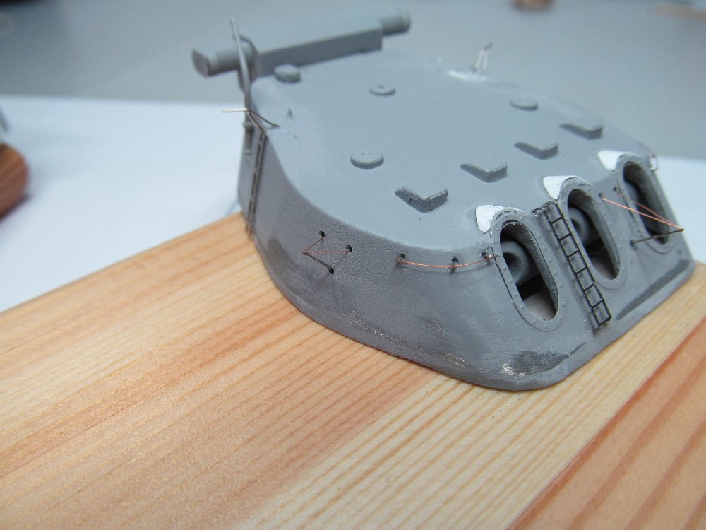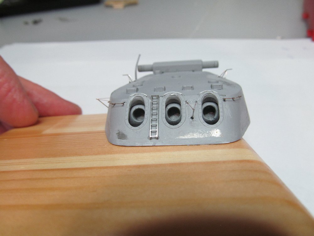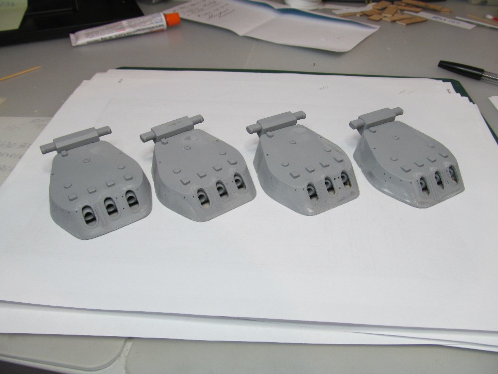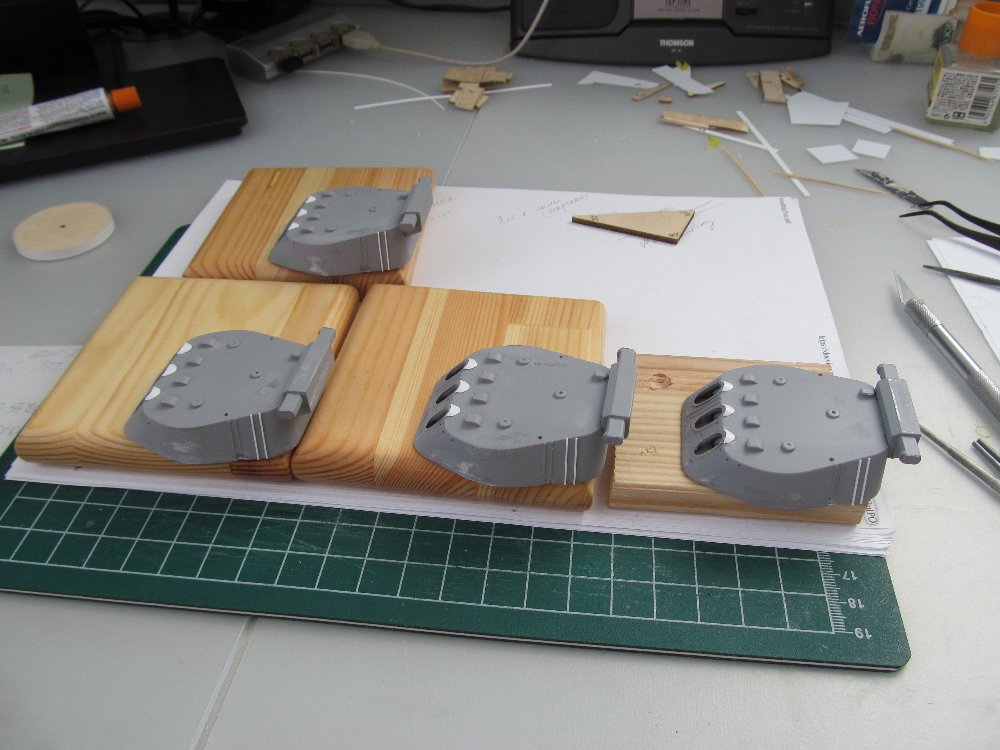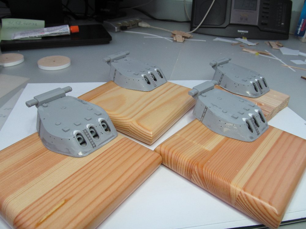 Понял, что наплывы над амбразурами башен ГК из шпаклёвки никуда не годятся.... и начал делать их из пластика.
