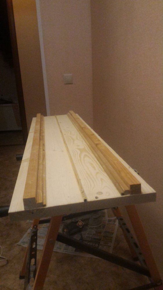 На небольшом столике прижимаем палубу рейкой. Рейка выставляется так, чтобы приложенный кондуктор попал на ряд нагелей