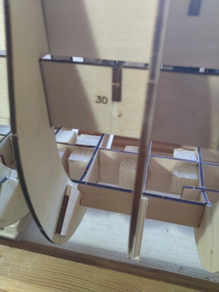 На сегодня установлены все шпангоуты, но не приклеены к стрингерам, как советует журнал. Приклею по готовности палуб.