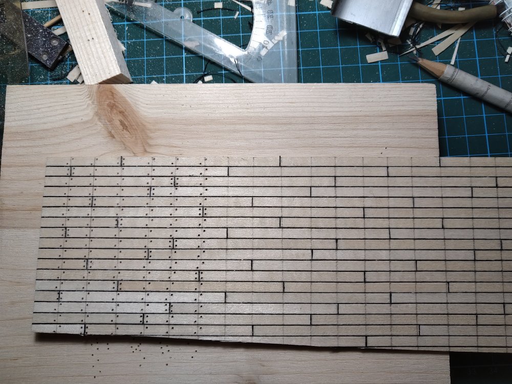 Палубы жутко изведены. Но надеюсь, что когда приклею их к бимсам, кривизна уйдет. Погибь решил не делать, боюсь испортить.