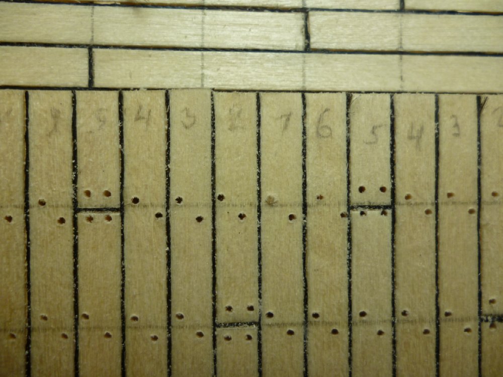 А сейчас полным ходом идет работа над палубами. Длину доски выбрал 7 см. На мой взгляд лучше смотрится, хотя и не по масштабу. Имитацию конопатки делаю черной ниткой. И не решил пока с гвоздеванием. Решу после укладки настила палуб.