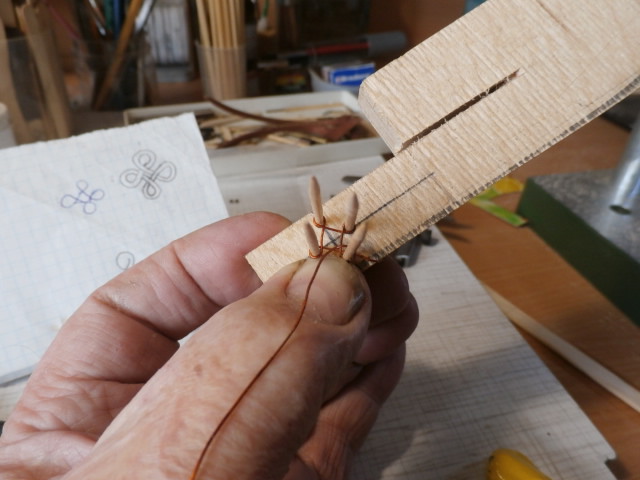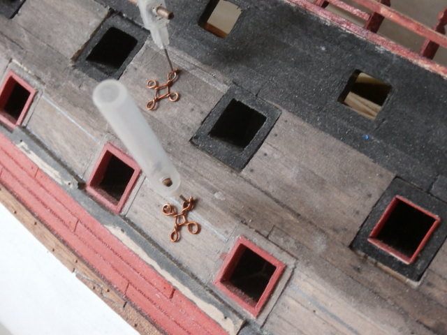 Сегодня я постараюсь написать, на мой взгляд, интересную для нас форумчан тему: о декоративном оформлении нашей модели. Если открыть постер, данный с первыми номерами журнала, то на бортах нашего корабля между артиллерийскими портами гон-дека и мидель-дека (первый и второй этажи корабля) укреплены кольца - обухи и рымболты держащие обухи. Смысл установки обухов мне не совсем понятный. Возможно они существовали для крепления дополнительных плавсредств (шлюпки, плоты ) во время стоянки или ремонта в тихой заводи корабля. Возможно для укрепления площадок (временных) и лесов во время ремонтн. работ. Мне идея разработчиков проекта в принципе нравится - как чисто декоративный элемент, заполняющий пустоту борта, Я же решил добавить от себя дополнительное украшение, изготовленное из тонкой медной проволоки (0,5 мм) взятой из катушки старого трансформатора радио. Вот что у меня из этого получилось: В центре проволочного креста будет укреплен обух в головке каждого рым-болта...