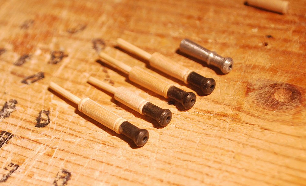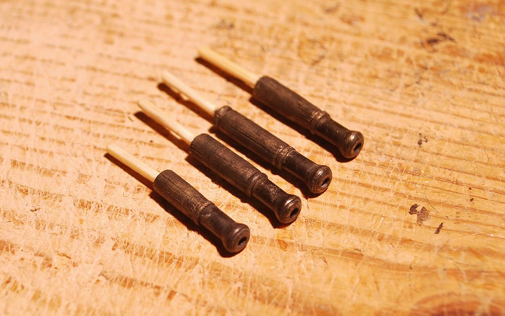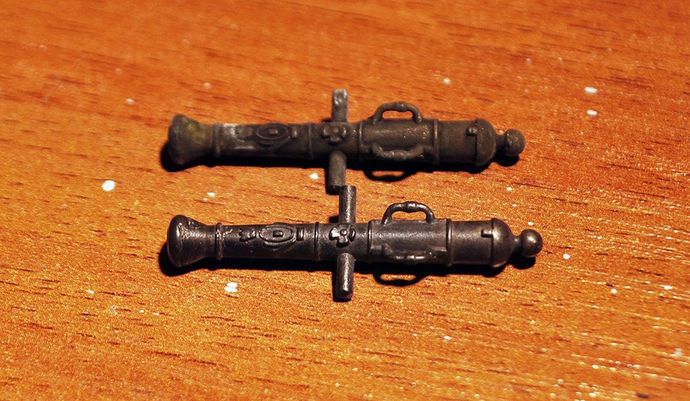 После чернения отполировал Дремелем с войлочной насадкой. Читал, что некоторые моделисты после чернения покрывают стволы маслом. Попробовал, особой разницы не заметил, а бронзовый оттенок исчез. Стволы стали просто черными, воронеными, для чугунных пушек самое то, но у нас бронзовые.