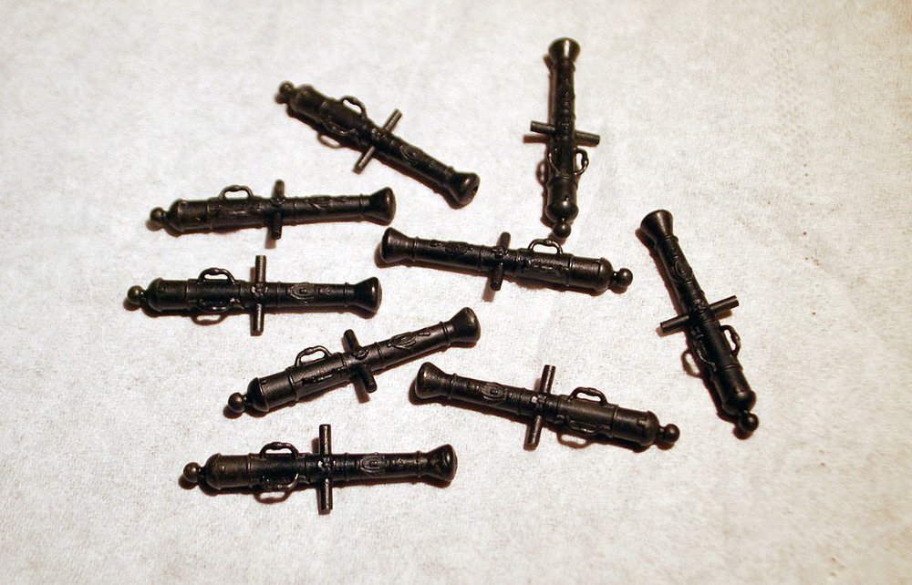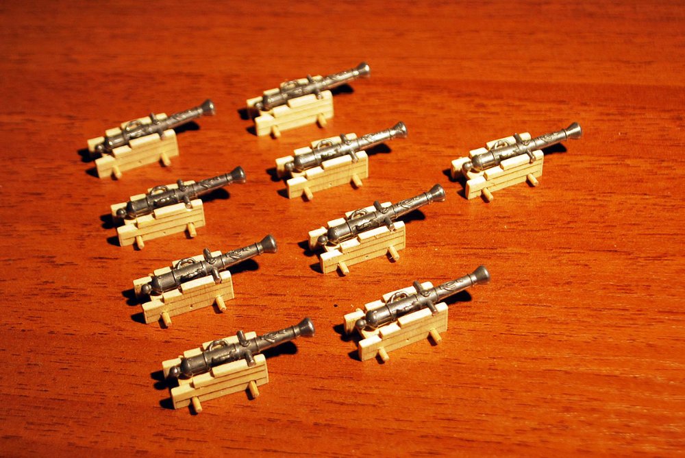Вот что более-менее приличное в пушках, так это стволы. Литье четкое, смещение половин форм небольшое и легко зачищается. Только дуло подкачало формой и ободок невнятный, но как зажать ствол и проточить его так не придумал. Чернил стволы Brass black, никакая краска не даст такого эффекта металла. Что-то близкое можно получить при окраске аэрографом, да и краска должна быть не простой металлик. Сплав ствола после чернения приобретает легкий коричневато-зеленоватый оттенок, для бронзы с патиной самое то.
