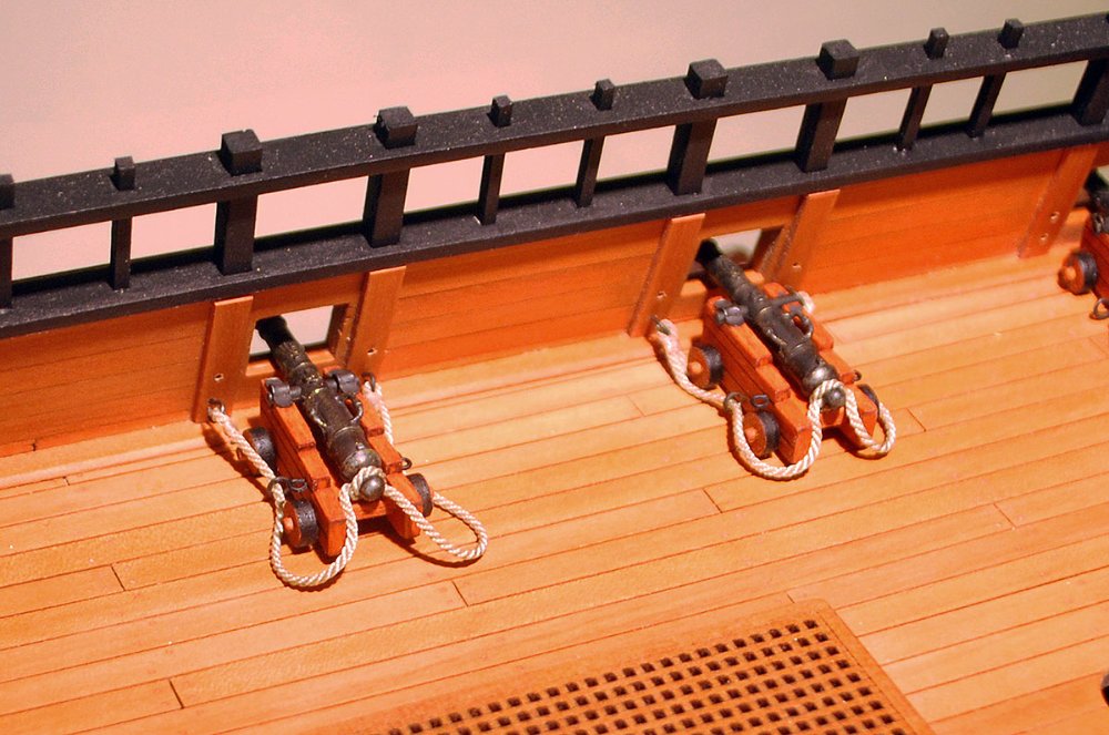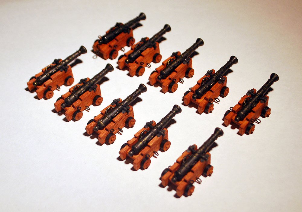 Настал черед пушек верхней палубы. Делать их конечно стоит сразу все, так и быстрее и гарантия, что пушки будут одинаковыми. Кардинально переделывать лафет не стал, нужно только подправить пропорции. Укоротил основание лафета на 2-3 мм, заузил на 1,5 мм и соответственно укоротил цапфы ствола, чтобы не выступали за щеки лафета. Фанерные торцы заклеил планкой, которая шла на палубы.