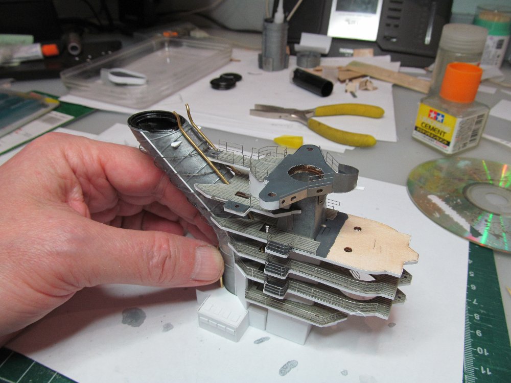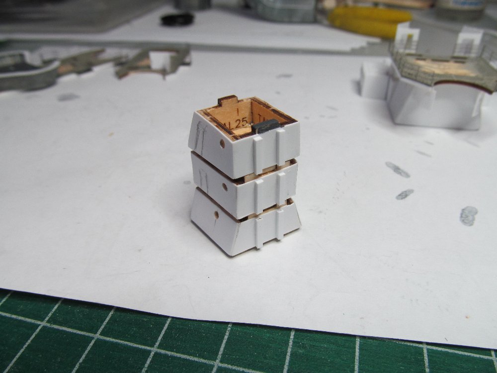 Продолжаю подгонять площадки ярусов передней надстройки под облагораживаемую переднюю дымовую трубу.