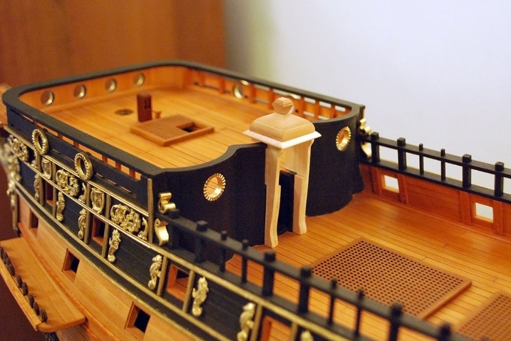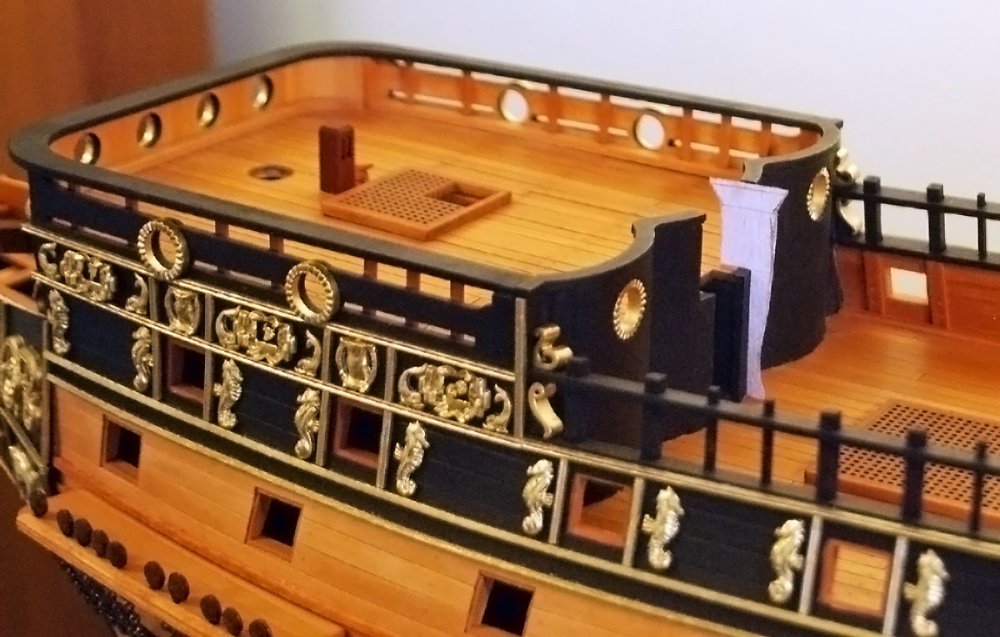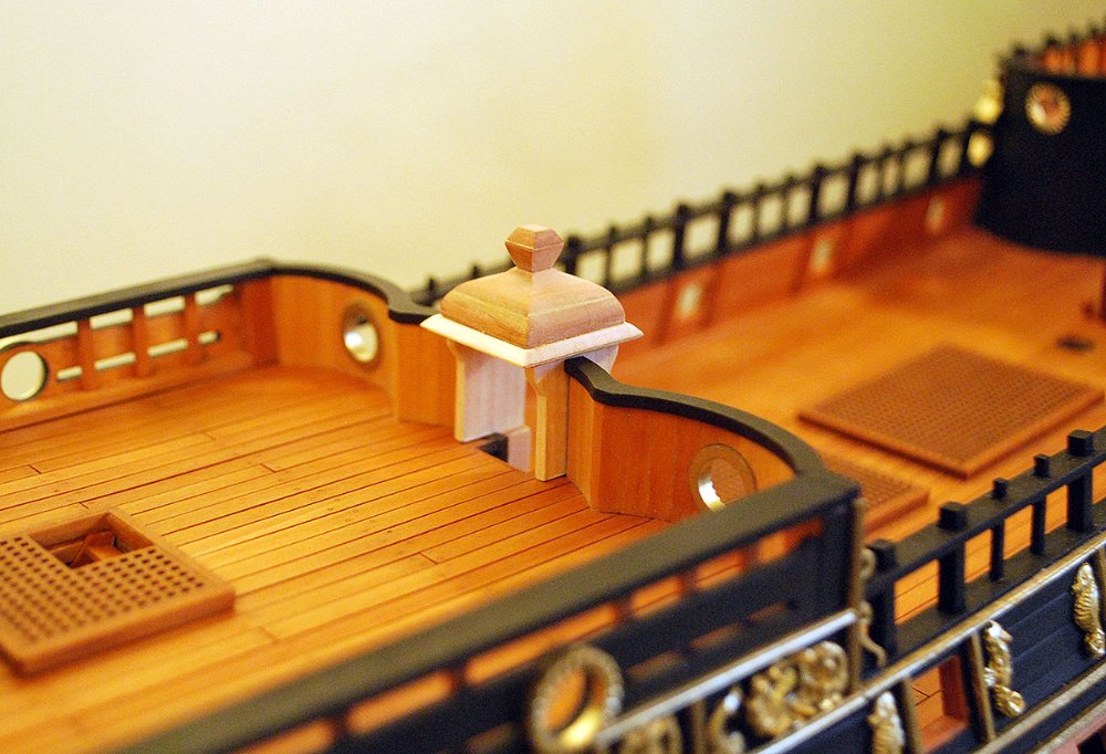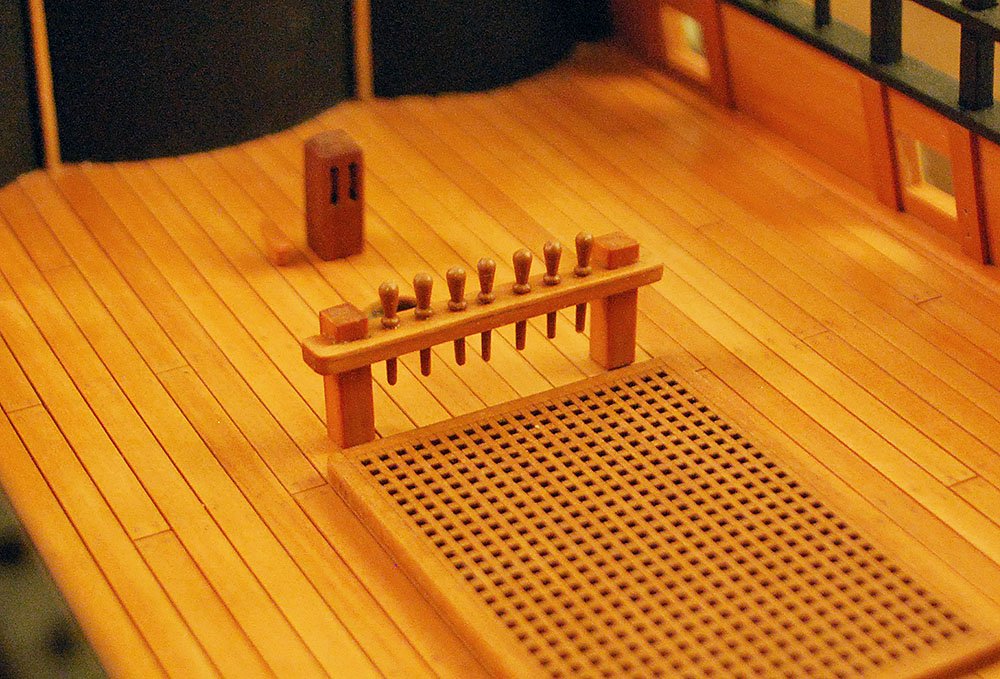 Кофель-планка вырезана из груши, покрыта маслом. Из планки обшивки делать не стал и уж тем более из фанеры, как на фото в журнале. Кофель-нагели хотел поставить покупные, но уж цена больно конская, да и форма сильно не впечатлила. Поэтому покрашены журнальные из металла, по размеру и форме мне нравятся.