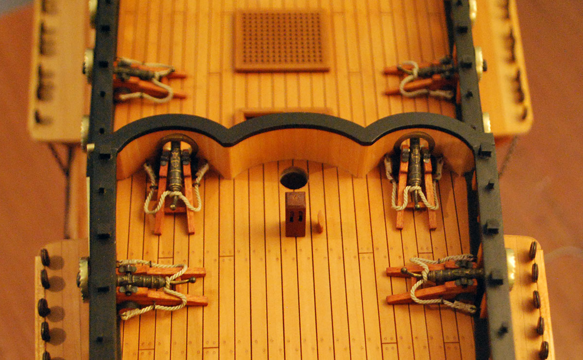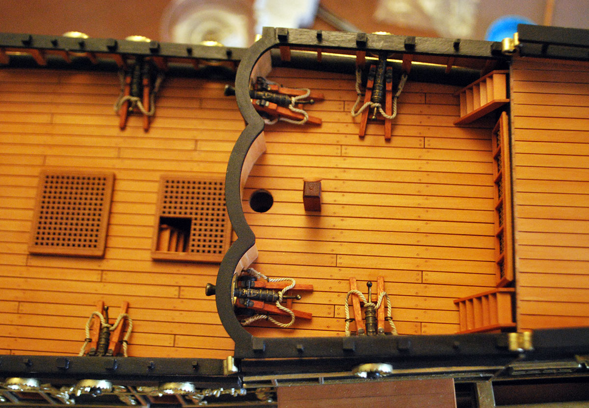 Начал устанавливать хвостатые пушки. Из обвязки остановился на изготовлении только брюка. Просмотрел фото, у кого уже установлены подкатные тали с блоками из журнала, ну огромные они, очень. Покупные блоки меньшего размера заготовлены у меня на тали пушек опердека, те, что на четырехколесных лафетах. Там попробую сделать полную обвязку, а хвостатые пушки обойдутся без подкатных талей, а вот "без брюк" как в журнале, совсем нельзя.
