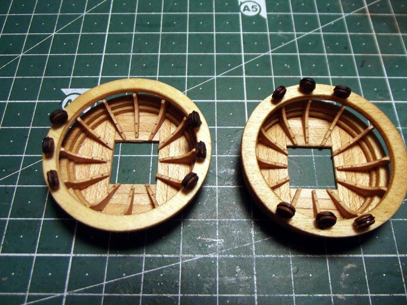 Ну вот, торцы фанеры заклеены, все марсовые корзины собраны и покрыты маслом. Пора доставать кругляк и переходить к мачтам.