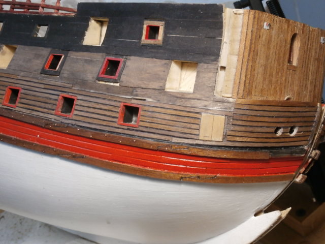 - Да! Нужно просто выполнять пошаговую сборку ДеА. Но к сожалению для меня это слишком просто и пресно. Я не могу не экспериментировать - такой уж у меня глупый характер. Этим я часто вляпываюсь в различные приключения и даже не всегда приятные... Когда я увидел на постере модели ДеА, на борту будущей модели оригинальную диагональную красную полосу, которая в корме взмывает вверх, а на носу глубоко ныряет в низ гон-дека, я тут же влюбился в этот элемент декора. Хотя здравый смысл мне нашептывал - Не связывайся! Это авантюра! Конечно нужно было просто топать по протоптанной тропинке пошаговой сборки модели, строя гон-дек без какой либо красной полосы, а саму полосу ниже и горизонтально. Но мы не любим ровную дорогу, нам подавай буераки! Я за время увлечения старинными парусниками ни разу в интернете не встречал модель у которой бархоуты были бы расположены не горизонтально, а под углом к поверхности воды. Хотя среди образцов крышек арт.портов в книгах знаменитых судомоделистов есть и такие крышки на которых наколочены брусья разрезанного бархоута и не только горизонтально, но и под углом - были. Система обвязки бархоутов силового корпуса корабля сложная с инженерной точки зрения проблема. Она должна противостоять любым нагрузкам от веса корабля, ветровым нагрузкам рангоута и парусов и от действия своей же артиллерии, особенно при стрельбе залпом и даже всем бортом корабля.