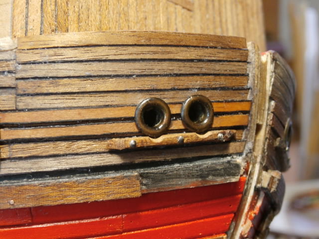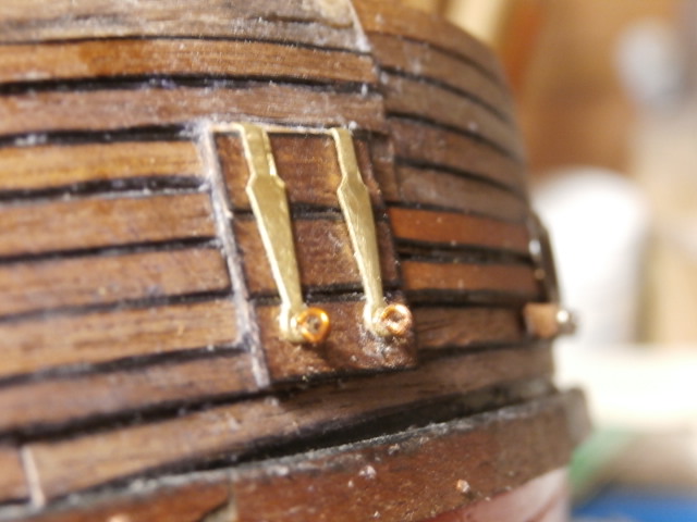 Укладываю две планки из груши. Они будут показывать, что место на корпусе , где установлены якорные клюзы усилено.