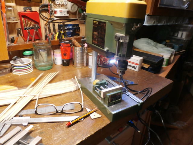 Корпус устройства делаю из многослойной фанеры. Ни чего другого под руками не оказалось.Рабочие органы из китайских 2 мм шампуров. Конечно многослойная фанера не совсем =айс=! Обычно слои фанеры различные по твердости. Но сверлильный станок от Проксона имеет довольно жесткую конструкцию пиноли и сверло не "убегает" в сторону., что возможно бы получилось если сверлить ручной эл.дрелью!
