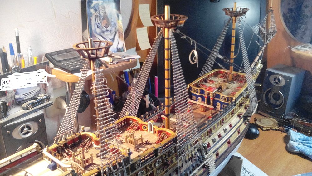 Совсем скучно стало на форуме. Один Сергей Николаевич (КЕРВА) исправно отчитывается по своим достижениям Решил последовать его примеру,и хоть работы по такелажу далеко не закончены, показать что сделано на сегодняшний день. Такелаж и проводку делал по своему, вариант от ДеА даже не смотрел. Такелаж делаю более насыщенным, стараюсь держаться ближе к прототипу.