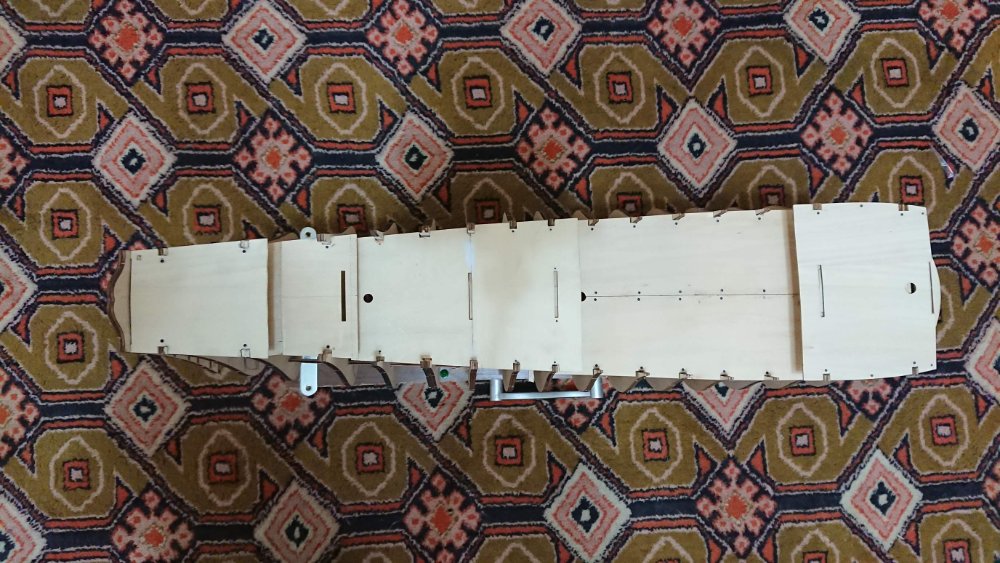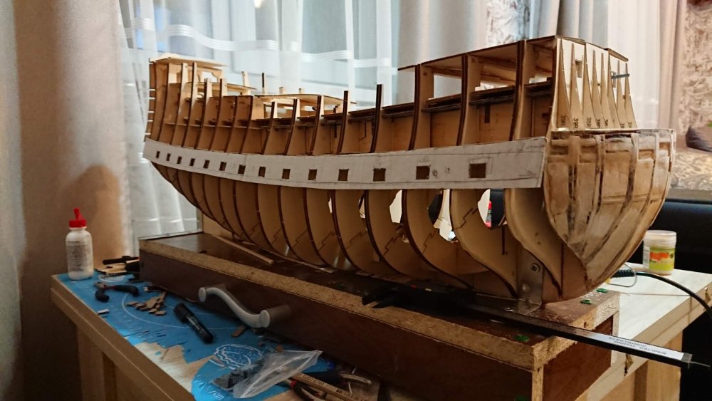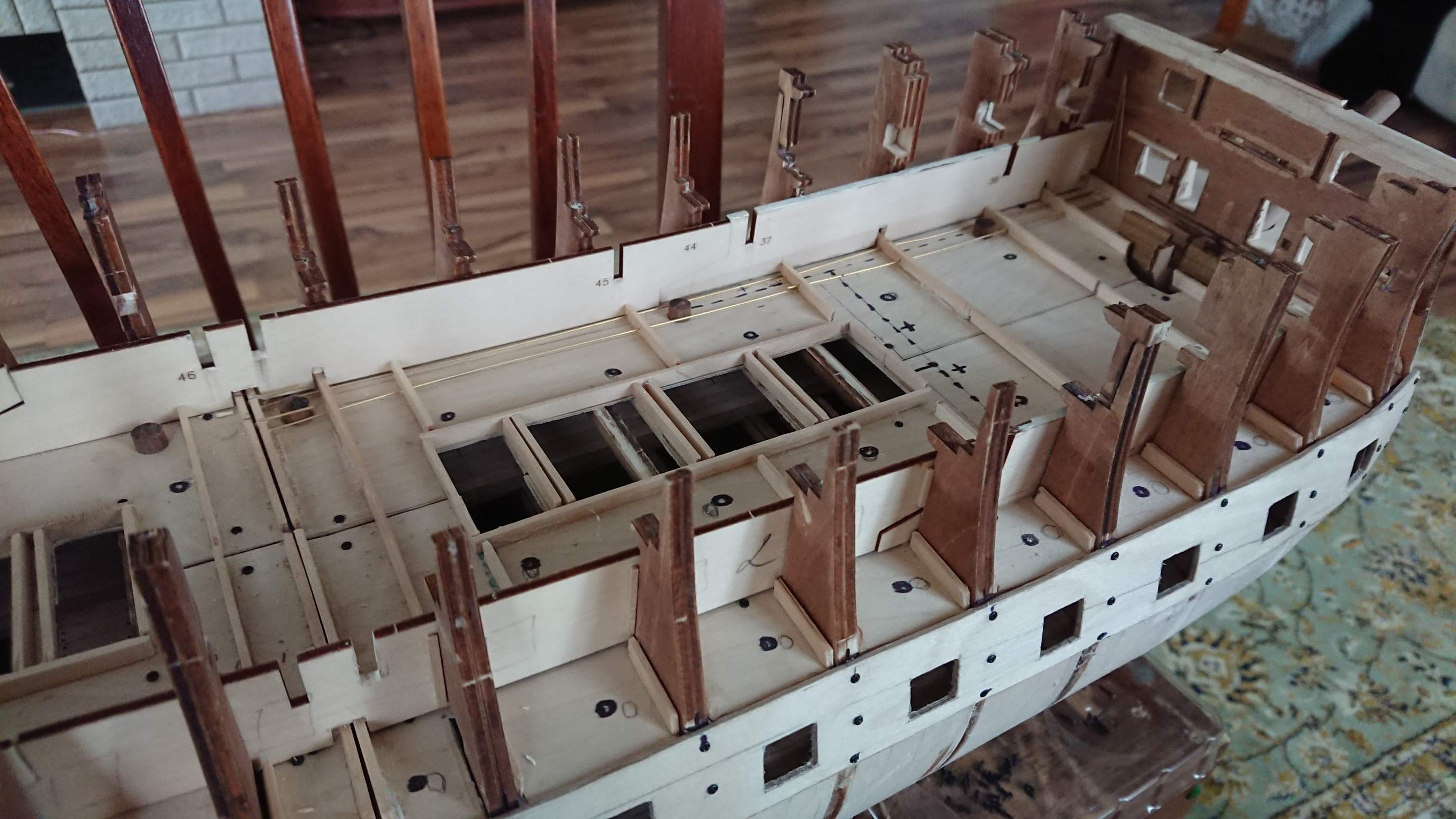 Итак сухая сборка продолжается, окончательно определился с палубами. Подготовил шаблон из картона для пушечных портов нижней палубы (гон-дек) Постараюсь использовать фанеру 2 мм сплошную, от носа до кормы. После начну клеить шпангоуты к килевой раме. И начну подготовку к чёрной обшивки, заполнения шпации бальзой.