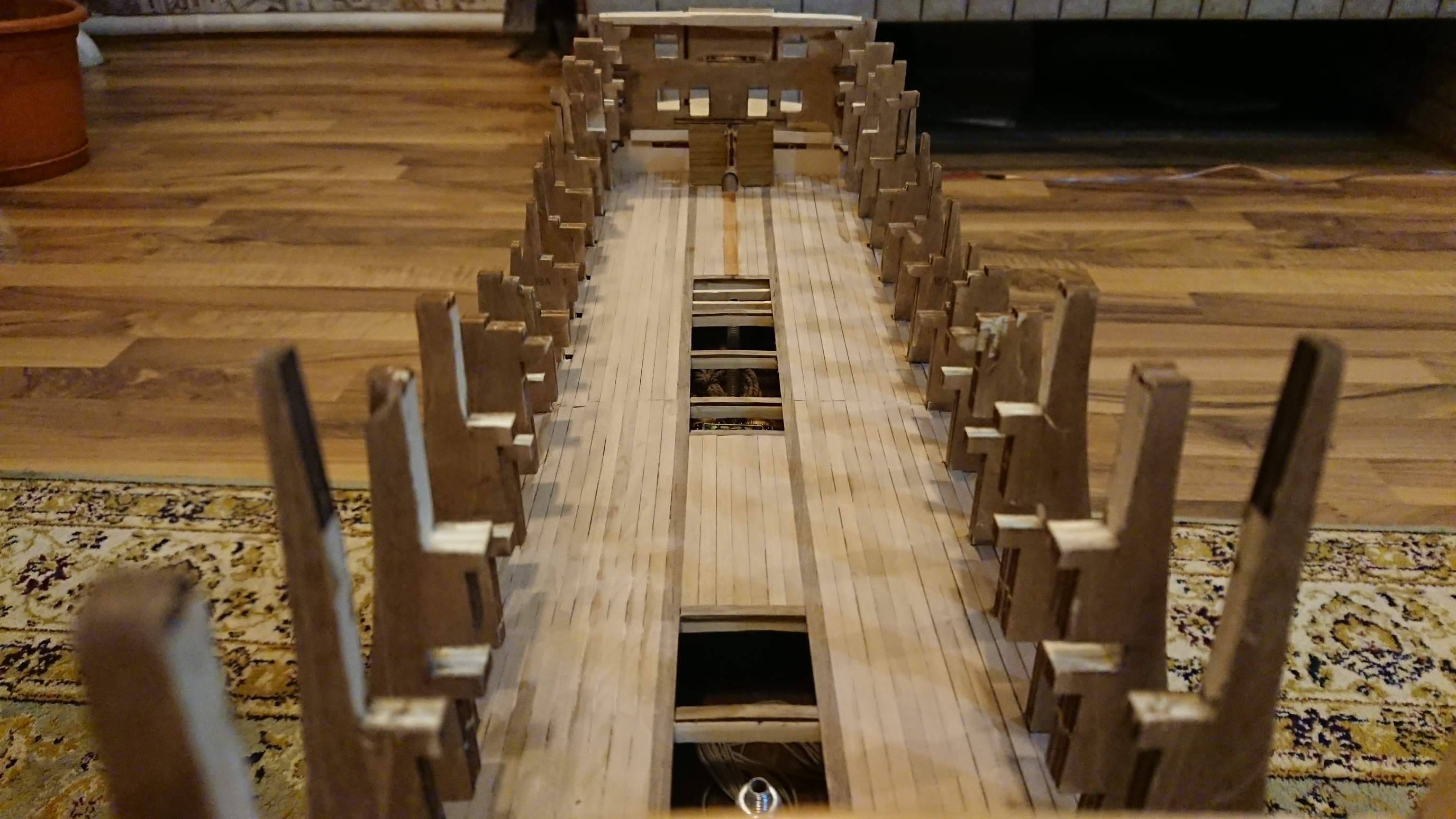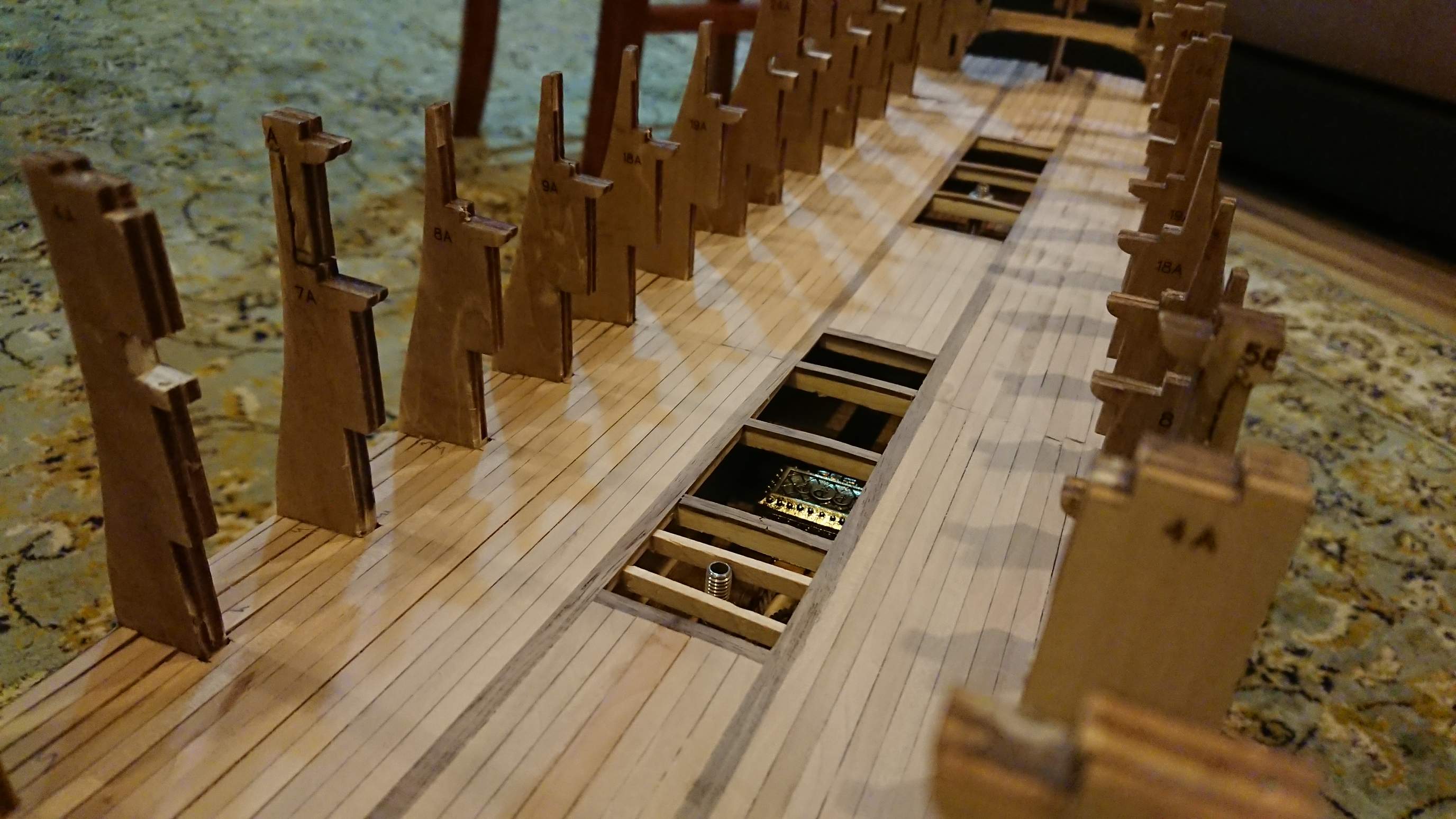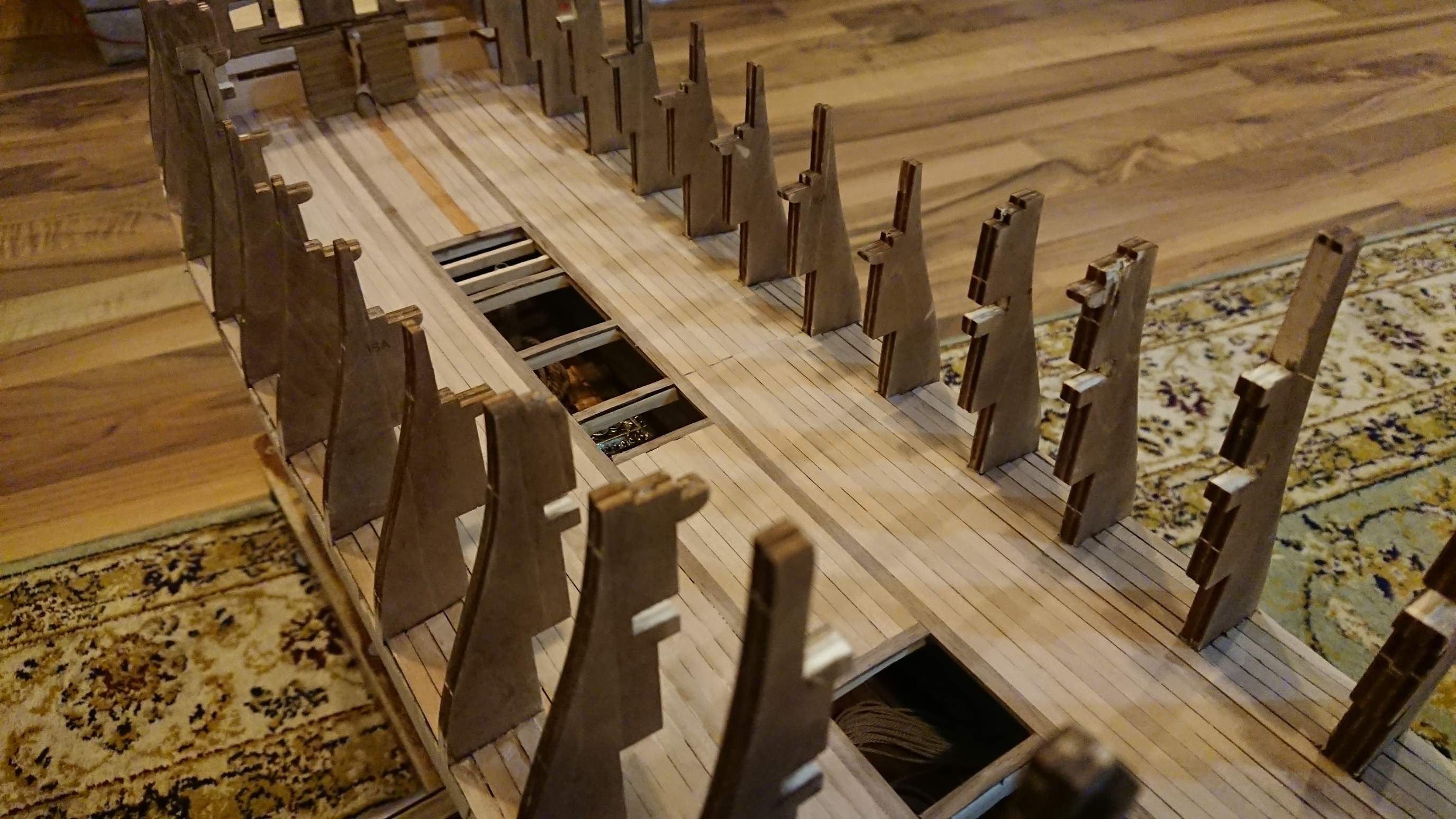 Здравствуйте, красиво у Вас получается,но разьве будет видно внутреннюю палубу?и ещё пару вопросов:каким диаметром сверлите отверстия (под имитацию гвоздей и что будете использовать вместо гвоздей)?и что за рейки используете для обшивки палубы, которые в наборе или нет?