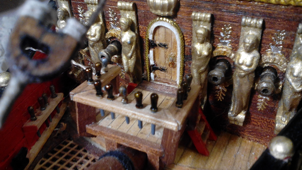 2. Два балкона с большими "королевскими" воротами по бортам корабля? Уверен здесь просчет разработчиков проекта. Иметь большие, тяжелые ворота, которые бы открывались в "никуда!" Конечно нужна площадка! Иначе ни адмирал, тем паче король не поймут этой шутки судостроителя... Я постараюсь изготовить эту площадку, вместе с поручнями (планширем). Буду стараться сделать в одно целое с русленем грот-мачты. Кстати матросская "курилка", где собирались свободные матросы была тоже на руслене корабля...