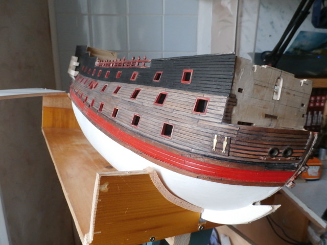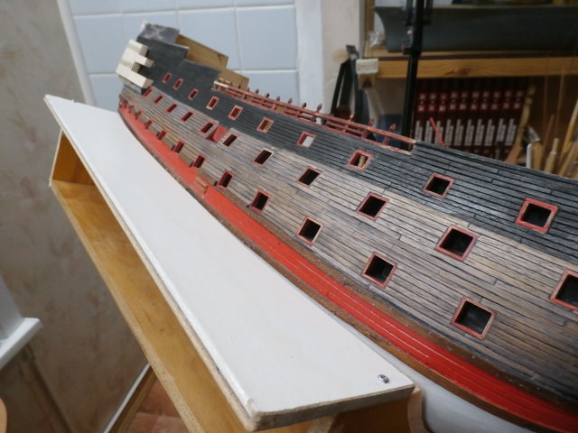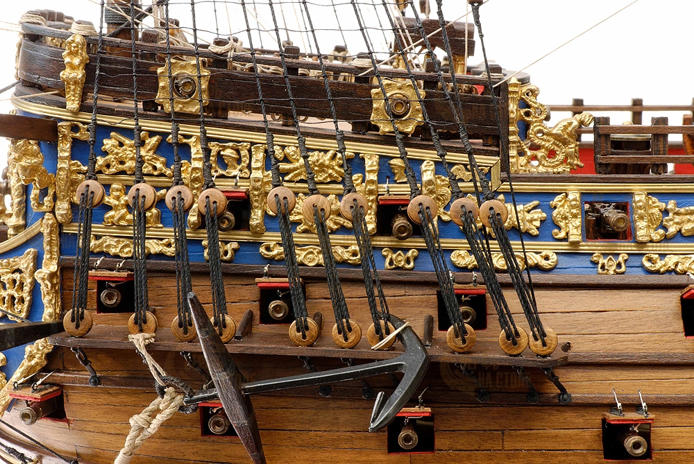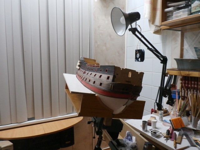 Да, да - конечно вы правы! На темном фоне любая золоченая безделушка смотрится ярко, подчеркивая форму детали для зрителя. Я считаю находкой для нашей модели в проекте и белоснежное днище корпуса. Оно как бы уравновешивает мрачный верх корабля. Я сразу не додумался показать на фото днище корабля, оно в работе "зажато" колодкой моего стапеля.Сейчас исправлю своё упущение. Вообще, я сторонник темных, даже мрачных моделей. Но это, как говорится "На цвет и свет..." Ведь, когда зритель подходит разглядывать модель военного корабля ХVII века, да еще со славой нечистой силы, он ожидает чего то мрачного... Хотя конечно, возможно я и ошибаюсь. Французы и в те времена,раскрашивали свои корабли в легкомысленные "васильковые" цвета, называя даже сам, этот цвет - королевским! Я же выбрал для своей модели лейтмотив -красный! Это главенствующий цвет военной Великобритании! Спасибо за вопрос! Удачи Вам и конечно Здоровья!