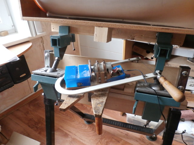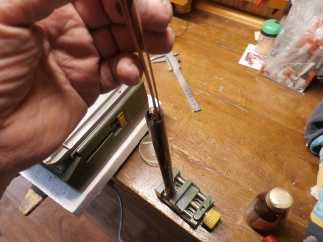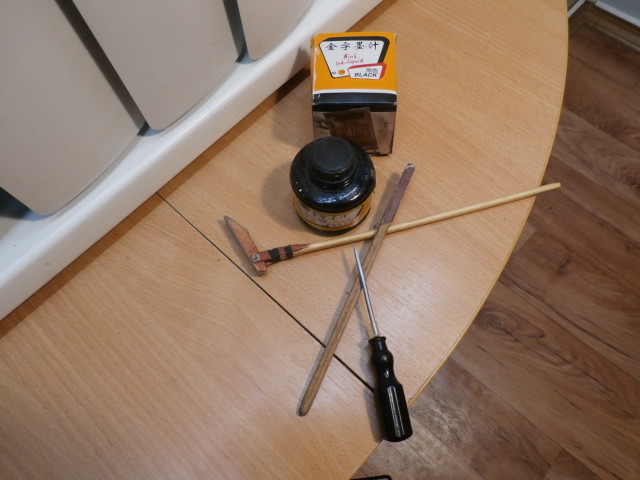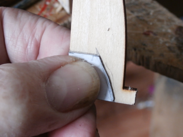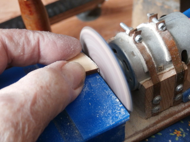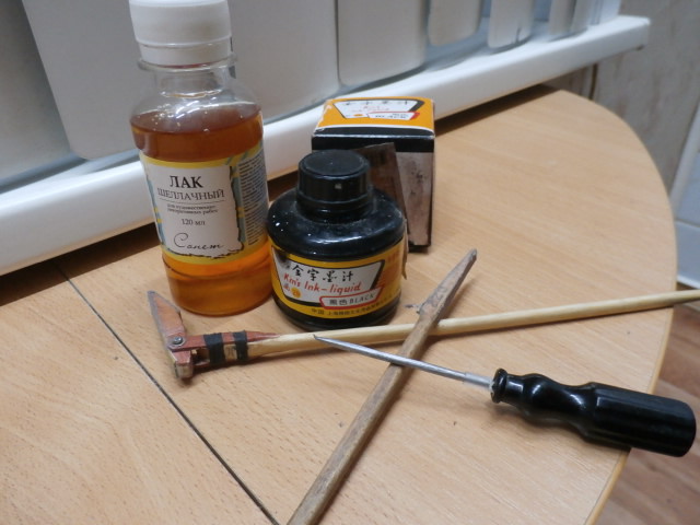 Думаю, возможно кому то интересен мой инструмент, который я соорудил специально для чистовой обшивки Повелителя. Он простенький, но довольно эффективный. Для того что бы подчеркнуть , что корпус корабля сооружен из отдельных досок обшивки я соорудил шило. Его сделал из отвертки заточил шилом, самый же кончик я согнул в виде птичьего коготка. Шилом я пробегаю по шву между планками, пока клей не за кристаллизировался. Узкая щель между планками обшивки очищается от остатков клея и стр. мусора.Планки обшивки я напилил на микроциркулярке (макетке). Планки напилены из букового шпона. Ширина 2 мм. После приклейки их от влаги клея чуть ведет, а значит приходится после приклейки чуть зачищать неровности абразивом. Штатный "сухарик" слишком крупный и неуклюж,а значит пришлось придумывать микро сухарики. На покатых "боках" корпуса очень удобен сухарик с шарниром. Для окраски верха корпуса решил использовать китайскую тушь. Что ж, хорошо "работает" с тушью шеллачный лак...