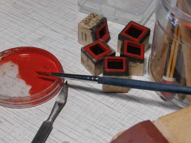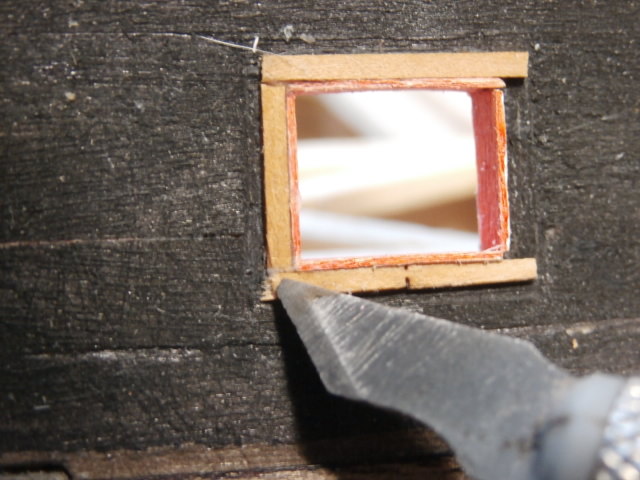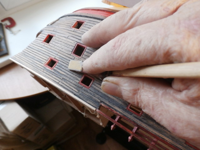 Буковые планки я морил в водной морилке цвета "Эбеновое дерево" - черный цвет. Планки лежали в морилке 4 часа. После приклейки клеем ПВА приходится подшкуривать абразивной бумагой,добиваясь однородности обшивки корпуса. Потом прокрашу черной китайской тушью и по верх наложу один, два слоя лака шеллачного. Но это в будущем, а пока обустройство арт.портов, наклейка буковых планок...