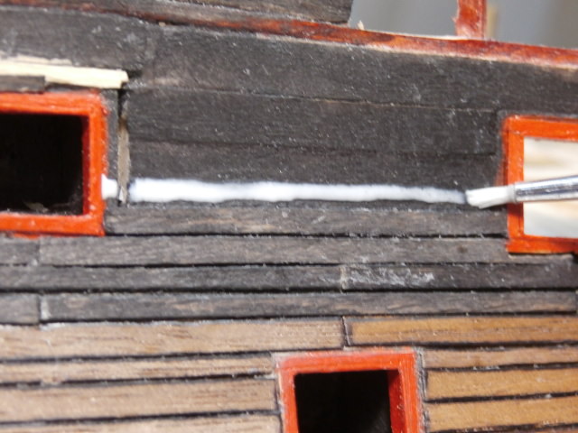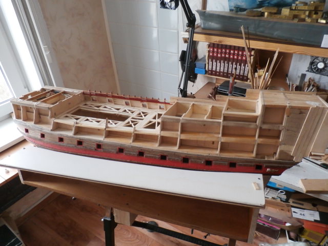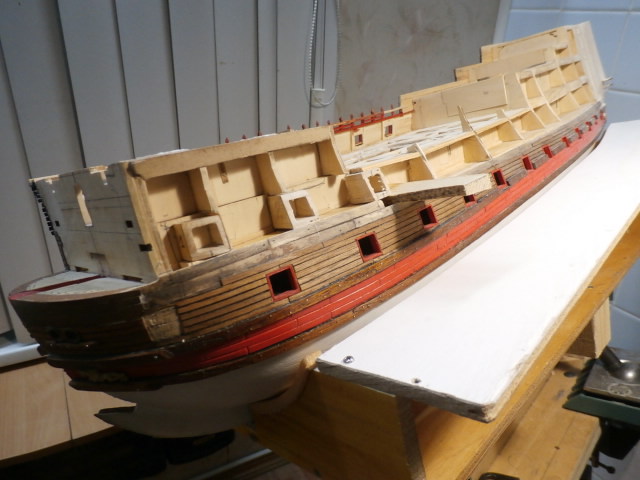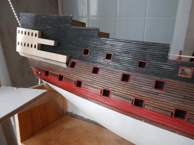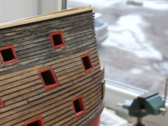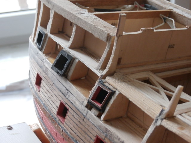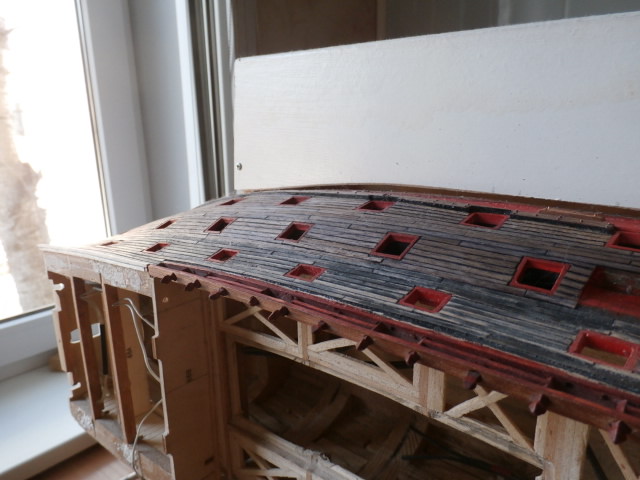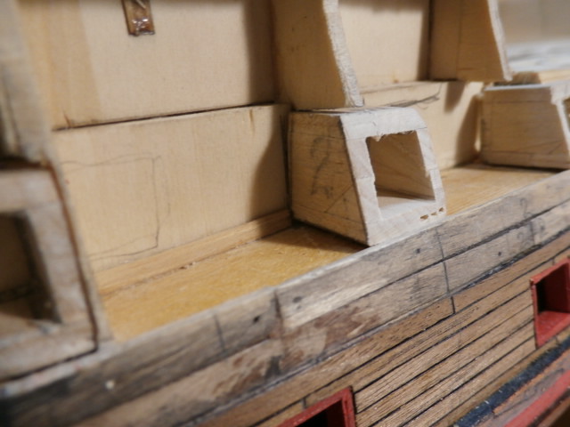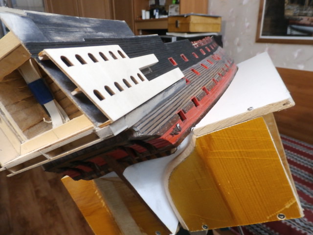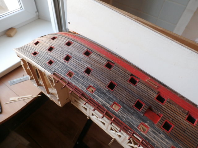 Во время монтажа черновой обшивки и монтажа кубиков - арт.портов, где будут крепиться фальш-пушки нижних деков нужно и предусмотреть деревянные утолщения для крепления русленей под черновой обшивкой корпуса модели. Удачи всем и конечно Здоровья!