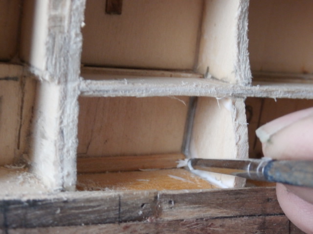 Все дело в распределении и укреплении колодок арт.портов по бортам корпуса модели. Мне приходится на силовом корпусе добавлять дополнительные фанерные переборки, на которых при помощи клея закреплю колодки-порты. Ну а затем после обточки, по верх наложу рейки вначале черновой обшивки, а уж после чистовой обшивки модели. В итоге получаю очень крепкий и прочный каркас корпуса модели...