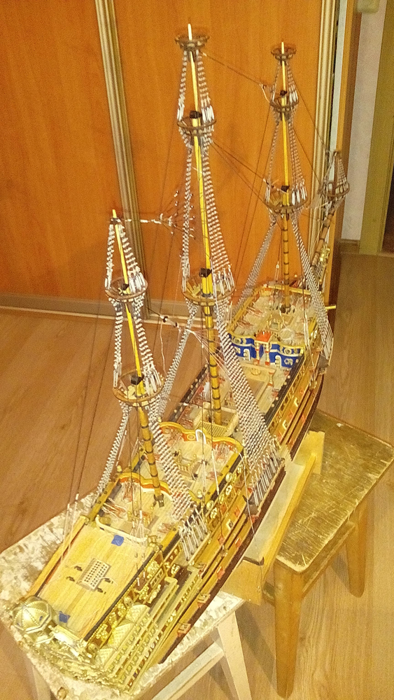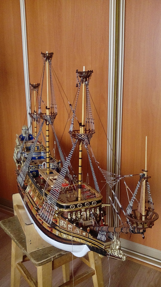 Совсем скучно стало на форуме. Один Сергей Николаевич (КЕРВА) исправно отчитывается по своим достижениям Решил последовать его примеру,и хоть работы по такелажу далеко не закончены, показать что сделано на сегодняшний день. Такелаж и проводку делал по своему, вариант от ДеА даже не смотрел. Такелаж делаю более насыщенным, стараюсь держаться ближе к прототипу.