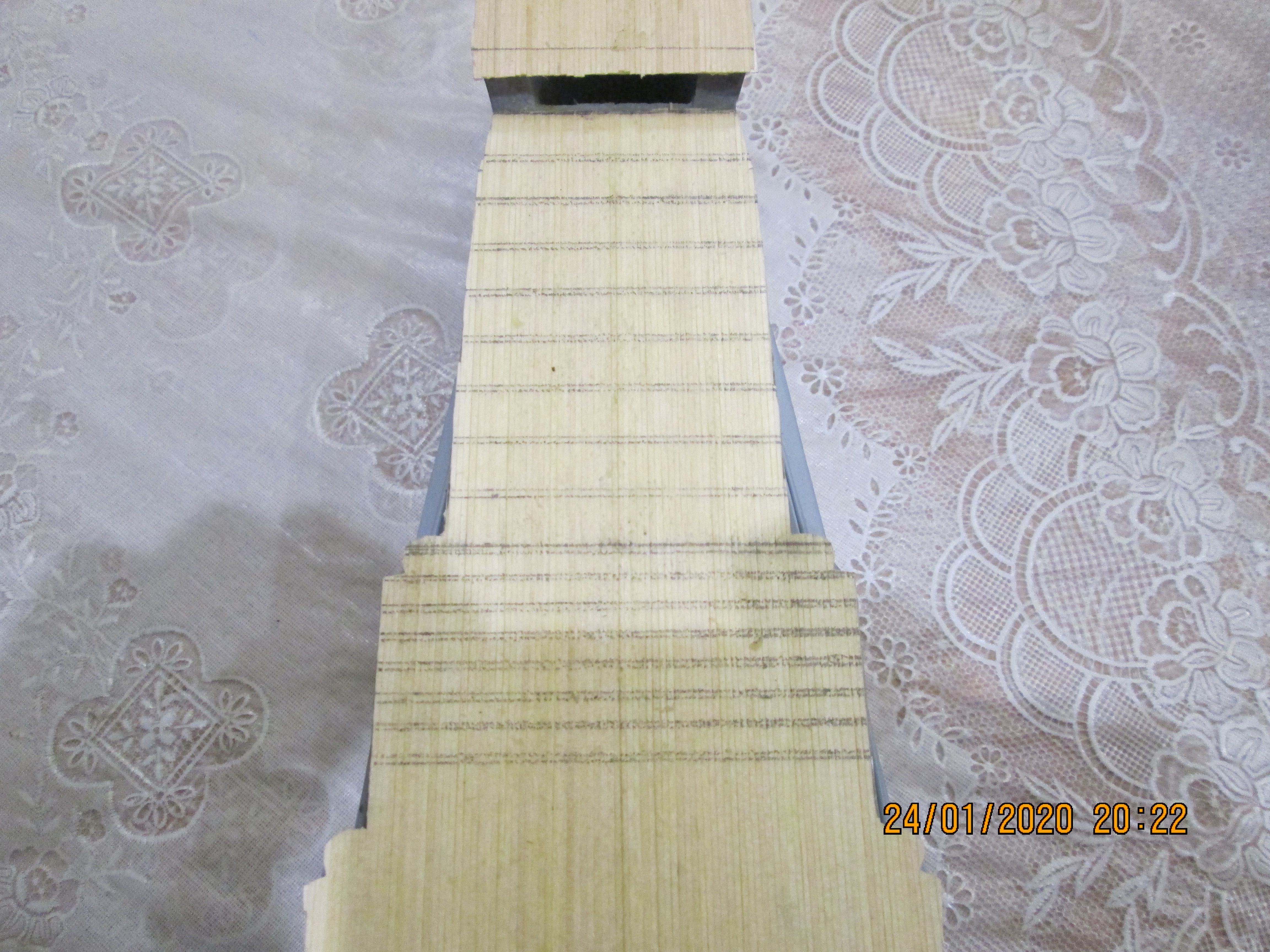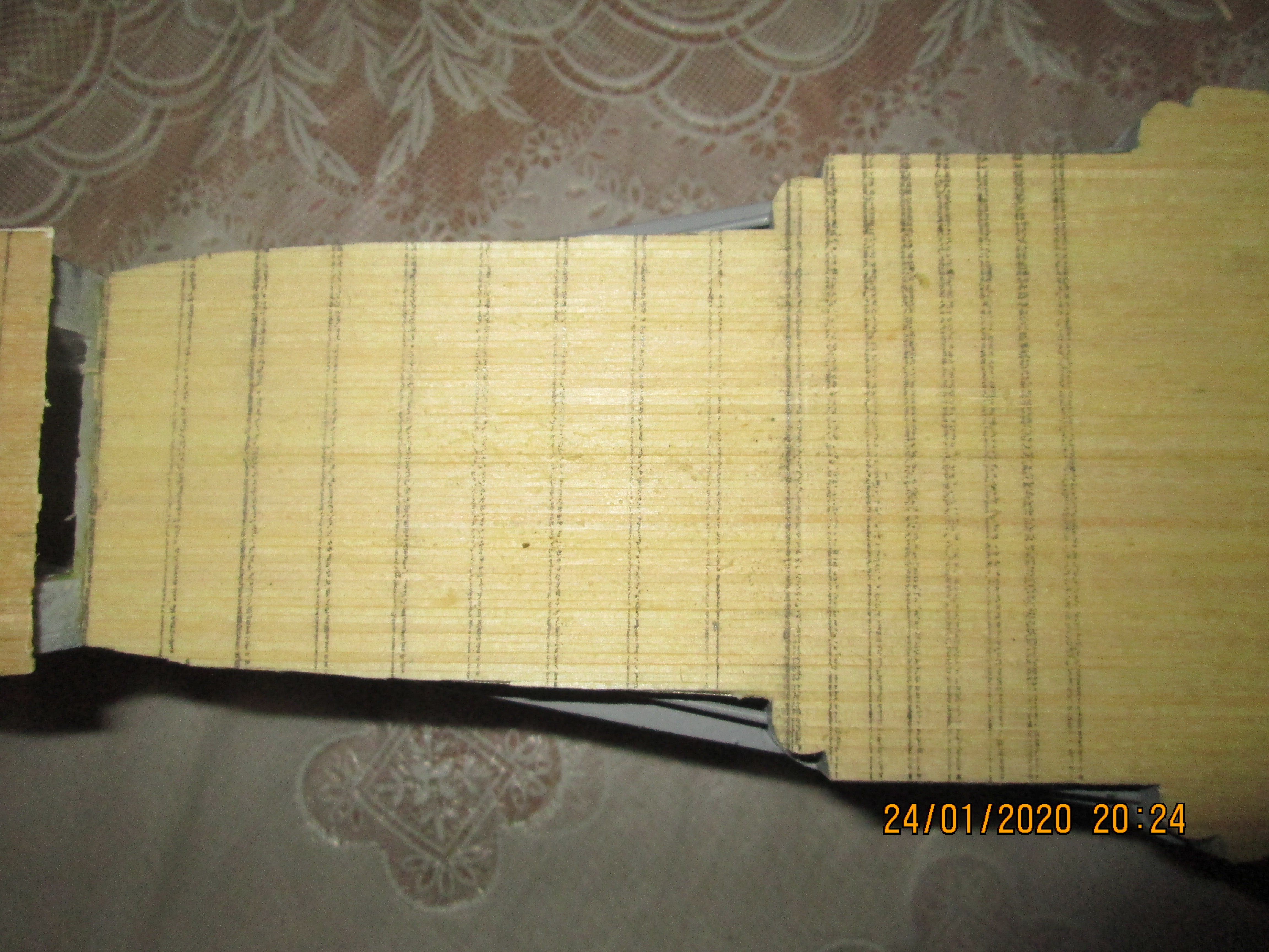 Всем привет. И так палуба. Сначала выровнил шпаклевкой фанерную палубу( у меня после манипуляций с корпусом в процессе исправления косяков издателя палуба стала выпукло в вогнутой) Затем наклеил листы картона. Нарезал шпон шириной 1 мм. Начертил осевую и понеслась, сложного ничего нет, но долго.Фото.