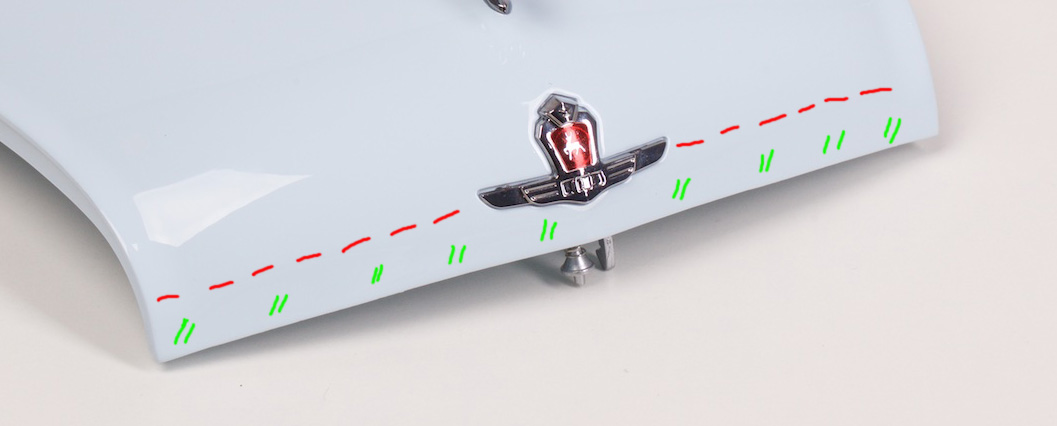 Покажу на фото. Вроде все понятно.. на капоте не должно быть никаких ребер и плоскостей. Все формы его округлые. Это не Газ 24!