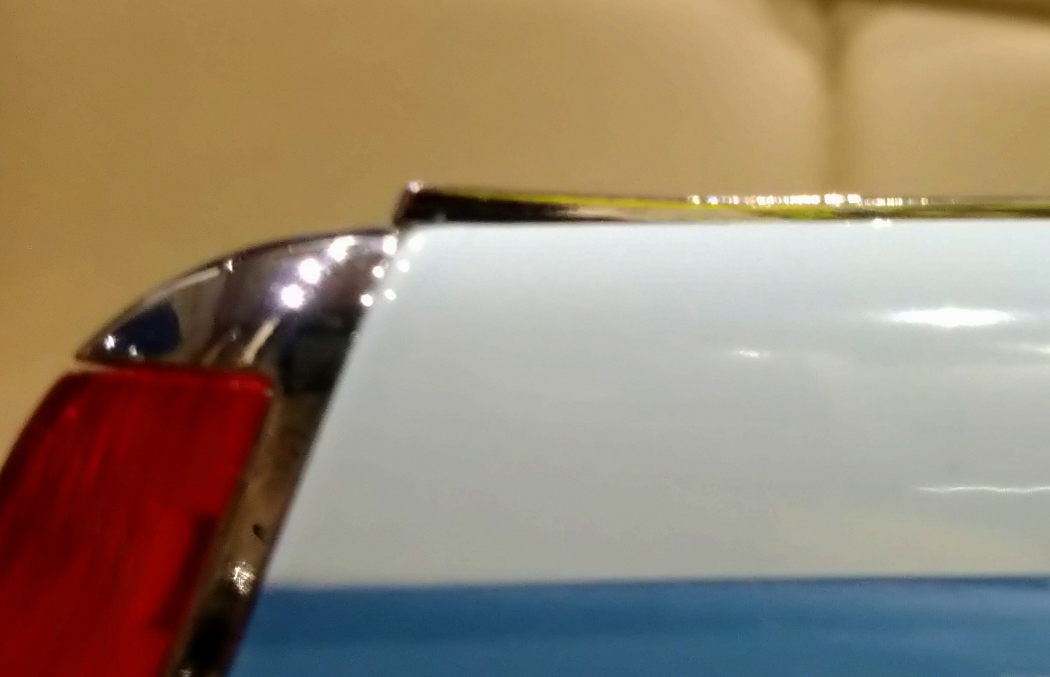 На ваших фотографиях виден брак по краске на заднем правом крыле, а также криво приклеенный прозрачный элемент заднего фонаря. Подтверждаю возможность замены заднего левого крыла (выпуск 104) и задних фонарей (выпуск 103).