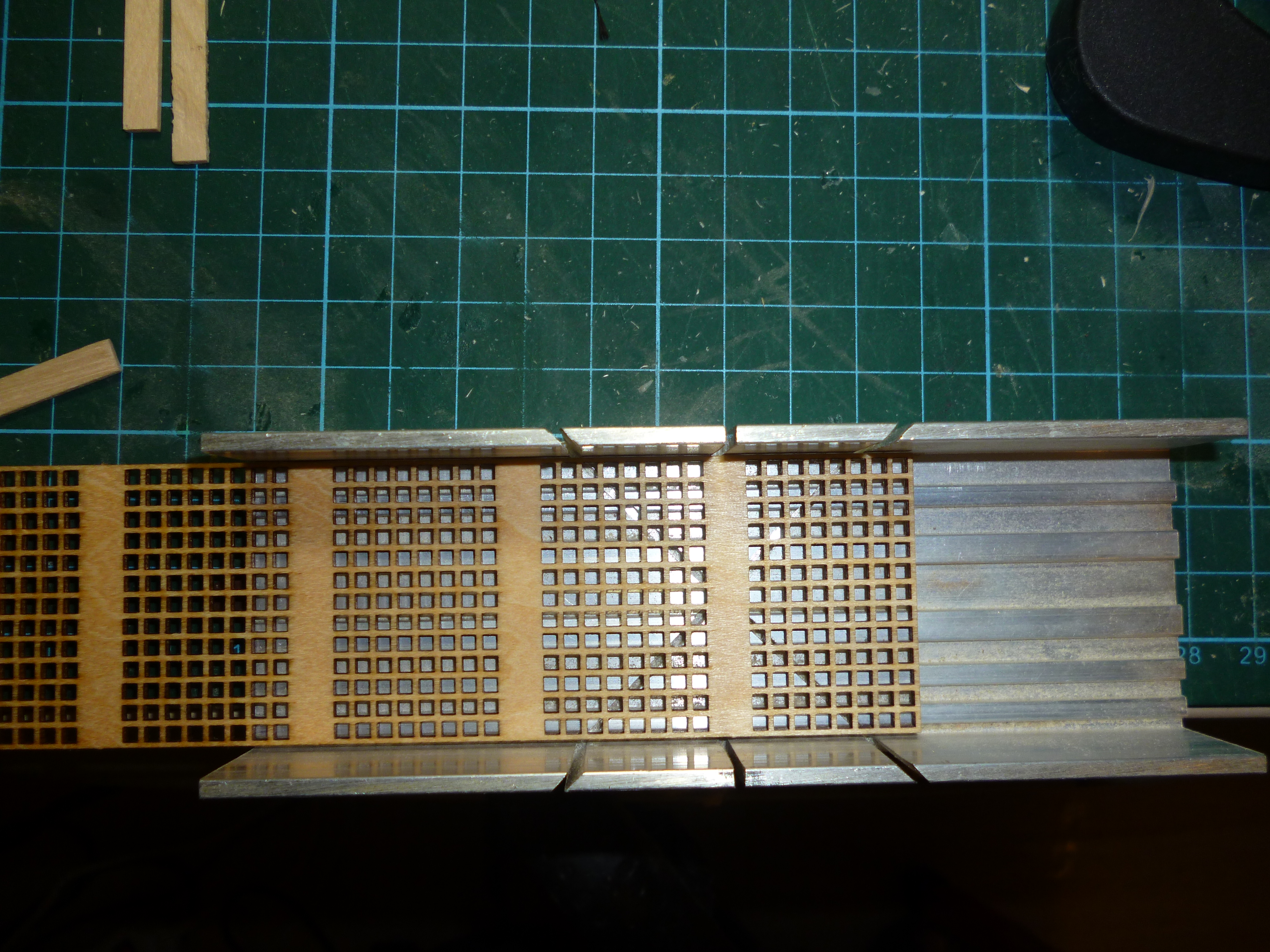 Совсем забыл про рустерную решетку из 38 номера. Конструкция из журнала мне не понравилась. Комингсы по-моему маловаты и какие-то бруски скругленные. Решил переделать. В ветке форума есть фото модели из Лувра. Там есть фото с палубой, где хорошо виден люк. Вот тут-то я немножко пожалел, что не прорезал люк, пока была возможность, т.к. на музейной модели люки утопленные, т.е. без комингсов. Ну и конфигурация решеток совсем не такая, как у нас. И вот всплакнув немного стал переделывать решетку. Во-первых распили ее на отдельные части. Для того, чтобы сделать их совсем одинаковыми пригодились рейки, из которых предлагалось делать комингсы. Они точь-в-точь входят в отверстия решетки. Ну и начало процесса на фото