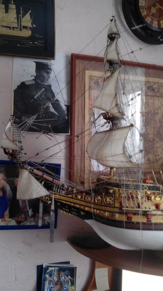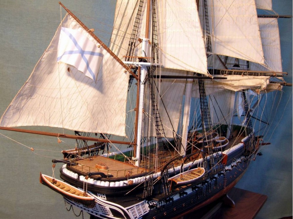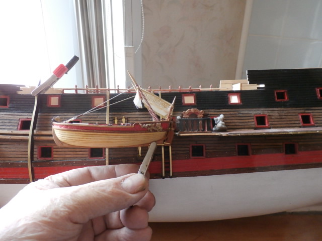 Здравствуйте Сергей Николаевич! С большим сожалением, всё обдумав, вынужден отказаться от вашей красивой идеи- "шлюпка за бортом".Я сейчас ставлю паруса и стараюсь наполнить их ветром, по всему выходит что корабль у меня идёт фордевинд. При таком курсе, вы понимаете, что шлюпка висящая за бортом подобна арт. ядру которое сокрушит и борт корабля и самоё себя.Но дело не только в этом.Для того чтобы переместить лодку за борт и обратно, необходимо стравить фалы некоторых снастей и отодвинуть их в сторону.У меня под "раздачу" попадают брасы и булини грот мачты и фордуны стеньг фок мачты, вы понимаете, что подобные действия на корабле, идущем под полными парусами и с приличной скоростью, могут привести,мягко говоря,к повреждению корабля.Есть ещё пара-тройка мелочей против, о них я писать не буду, слишком много бУкв. Вообщем совокупность всех этих нестыковок, на мой взгляд, делают лодку висящую за бортом такой нарочитой, показной нескромностью, совершенно не соответствующей реалиям того времени.Кроме того у меня подрастают четыре внука и два правнука (правда два внука уже взрослые), и я в тайне надеюсь,что когда они придут в гости и начнут задавать вопросы, я всё им объясню и расскажу как было по правде. А ситуацию с лодкой объяснить будет сложно.Вообщем убирать надо либо паруса, либо лодку. Мой выбор очевиден - я выбрал второе.