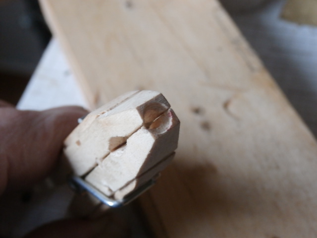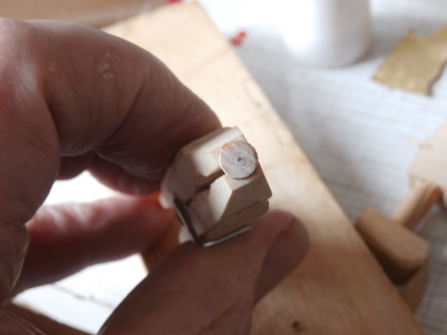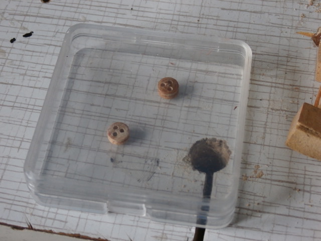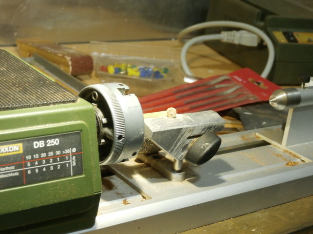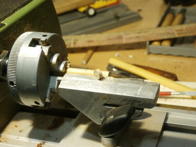 Так как юферсов патворк дал не много, и причем часть из них изготовлена из не очень качественной фанеры я решил по крайней мере нижние, самые большие на корабле юферсы изготовить самостоятельно. Юферсы готовлю на токарном станке от Проксона. Материал использую хорошо просушенный бук. В своё время один хорошо знакомый одиннадцатилетний приятель мне подарил старенькое пианино. Оба мы от такого подарка остались довольны! Он от того, что избавился, а я потому что приобрел. Вот из ручек тех молоточков, которые ударяют по струнам в механизме пианино я и изготовляю 6 мм юферсы для моей модели. Для работы на станке очень часто используешь не фирменные инструменты - резцы, а в какой то мере посторонние предметы, которые прекрасно справляются со своей задачей. Юферс изготавливаю в два этапа. Начале делаю круглую заготовку.Обушковой модельной пилой работаю как отрезным резцом. Канавку в теле юферса протачиваю алмазным овальным надфилем.