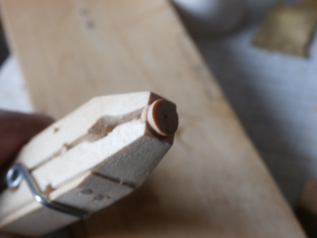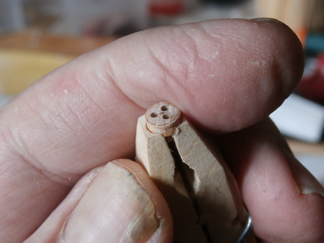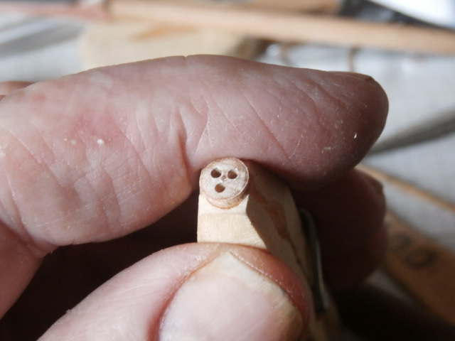 Как любая филигранная работа , изготовление юферсов не любит спешки. Суета и спешка губит качество юферса! По условиям работы юферса на корабле , отверстия должны быть максимально разнесены между друг друга и расположены между собой на 120 градусов!. Сами же отверстия должны быть как можно крупнее. Это дает возможность без проблем вести монтаж устройства на модели в будущем. Если же отверстие узко, то при протягивании через него снасти дается дополнительные нагрузки на деревянную детальку и не секрет - она может расколоться! Моя технология: Намечаю отверстие острым шилом, сверлю в начале сверлом 0,5 мм, затем 1 мм и уж потом прохожу 1,3 мм!
