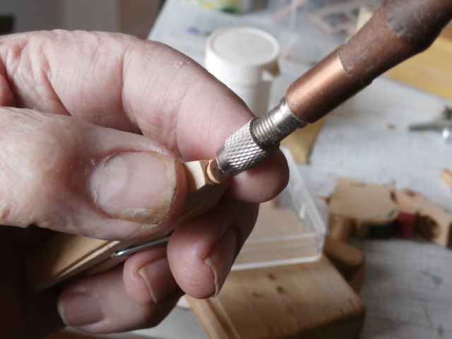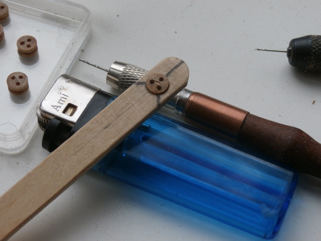 Изготовил новую приспособу. Склеил две палочки от мороженного просверлил отверстие, в которое с натягом вставляется круглая заготовка. При помощи шила намечаю место где будут просверлены отверстия юферса. Сверлю в три этапа. Первый - сверлом 0,5 мм на микро сверлильном станочке