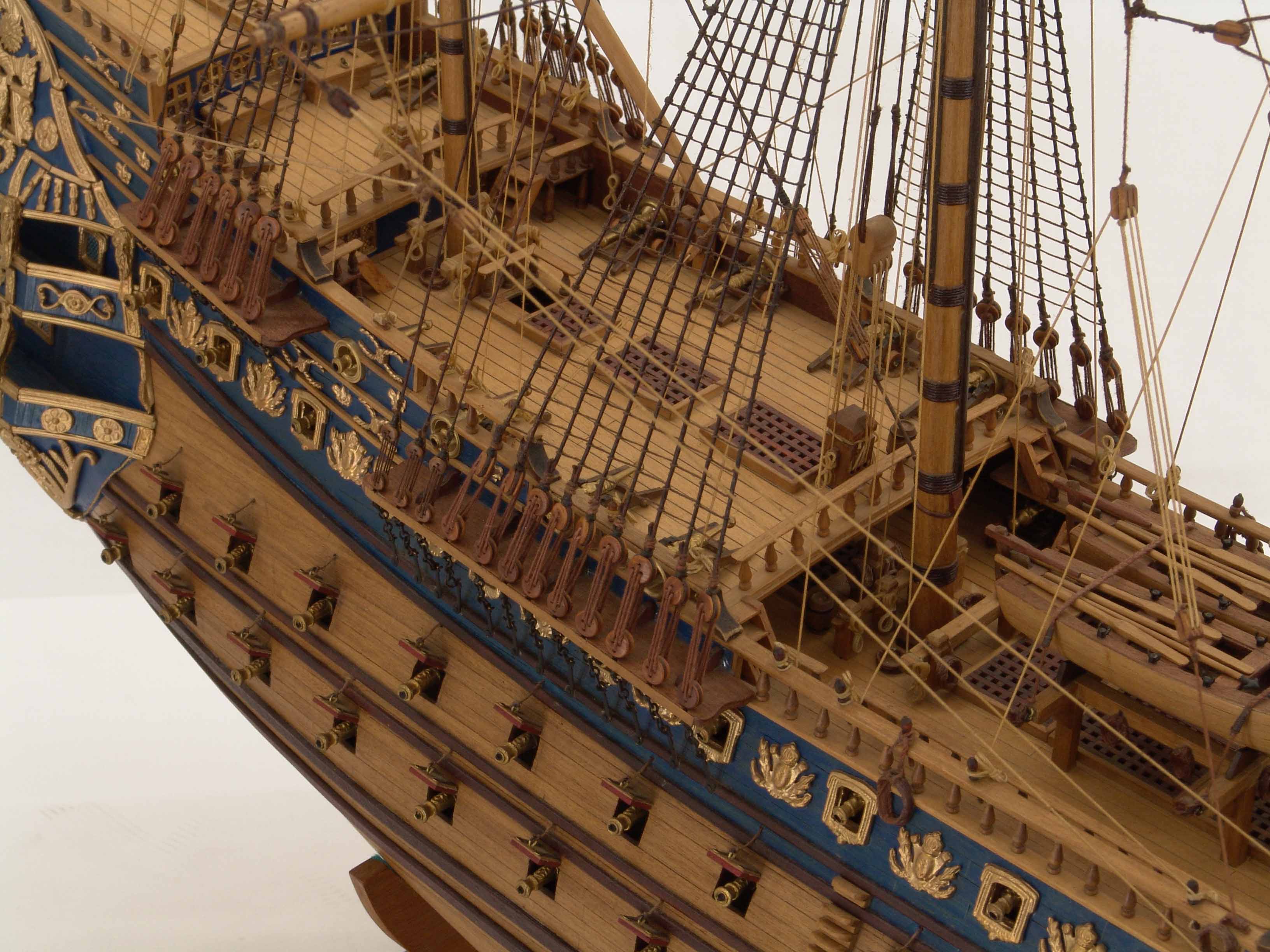 Относительно нашего прожекта: Всё же немного меня "покорабливало" то что флагман, громадный, для своего времени линкор имел в своём распоряжении раскрашенную, с развешанными "висюльками" прогулочную шлюпку, согласитесь, до слез мало. Это лодка для короля с его менестрелями и хорошим вином. Морякам же и кораблю требуется рабочая лошадка! Пусть без золотых вензелей но надежная, вместительная и крепкая! Вот такой то баркас я собираюсь поместить на кильблоках верхней палубы! Пусть "королевская" прогулочная шлюпка хранится на верху по верх баркаса.На это будут указывать такие признаки, как переносные киль.блоки в баркасе. Система крепления шлюпки, а сама она - шлюпка в это время будет подвешена за бортом на талях на уровне площадки "королевских " ворот. Я сейчас не уточняю, какие тали буду задействовать конкретно,это покажет жизнь во время монтажа.Тут есть еще один нюанс. Дело в том, что шлюпка за бортом, а корабль уже на ходу, под парусами?! Но может же быть такой случай, что король или адмирал на шлюпке пришел с берега или с другого корабля, поднялся на борт, а корабль, выполняя приказ капитана поднял паруса и вышел в море. Спешили, шлюпку еще не убрали на штатное место? Или другой вариант... Команда подготовила шлюпку для того, чтобы во время ближайшего рандеву пересадить знатного гостя на другой корабль?