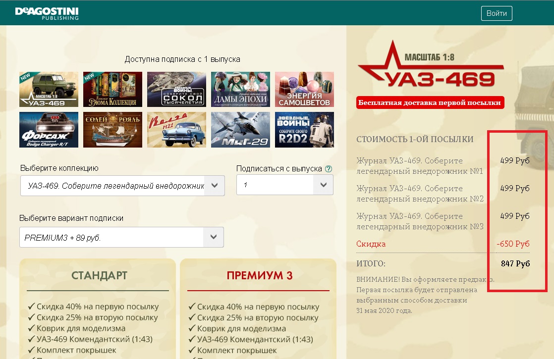 499*3-25%=1122,75р, что и отображается как в ЛК, так и совпадает с суммой указанной на первой странице сайта https://uaz469.deagostini.ru.