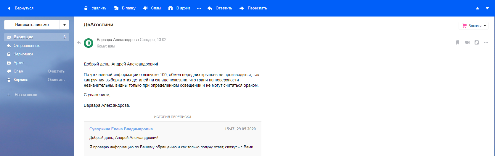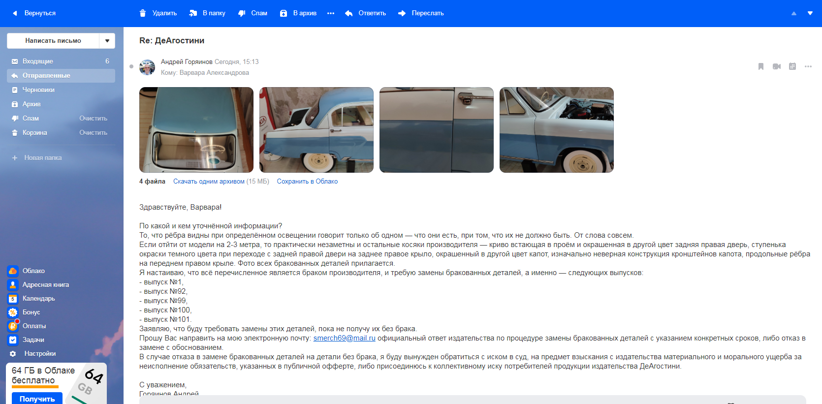 Сегодня получил на почту ответ издательства по поводу замены переднего правого крыла с продольными рёбрами. На момент запроса у меня, уже, было три крыла с рёбрами, но я настаивал на замене на деталь без брака. Честно говоря, не хотел выносить в публичную сферу общение с издательством, но такой ответ реально выбесил, поэтому публикую скриншот своего письма в издательство и приложенные к письму фото Предлагаю всем, кто столкнулся с браком проявлять активность при общении с издательством, и возможно, начинать готовить коллективный иск, если не будет опубликована официальная информация о сроках и процедуре замены бракованных деталей, или отказ в замене таких деталей со стороны издательства.