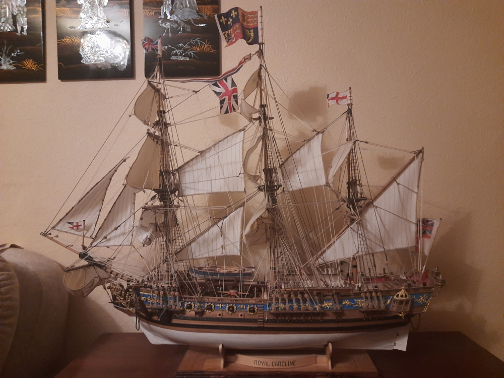 Добрый всем вечерок! На предыдущей модели "ROYAL CAROLINE" выписывал флаги на "верфи" они шёлковые и совершенно не держат форму. По верхнему и нижнему краю флага аккуратно наклеивал обрезок тонкого ( 0,4-0,5 мм) медного обмоточного провода с помощью прозрачного клея "момент-кристалл", это позволило придать флагам форму. Так же поступил и с вымпелом. Вот как это выглядит. Такую же операцию можно применить и к бумажным, двухслойным флагам, только проволоку брать потолще,напр. 1мм На мой взгляд основная трудность самостоятельного изготовления флагов состоит в нанесении нужного рисунка.sersir писал(а): ↑05 сен 2020, 23:21 Сергей Николаевич доброго время суток..Использовать пластик от упаковок интересная идея..но может смотреть на это по другому..смотря из чего сделаны флаги и вымпелы..если из бумаги то клеить на пластик не то...если из х/б то может крахмал или жидкий пва..пропитать и попробовать придать форму в процессе высыхания...А там как мэтры подскажут...С уважением Сергей