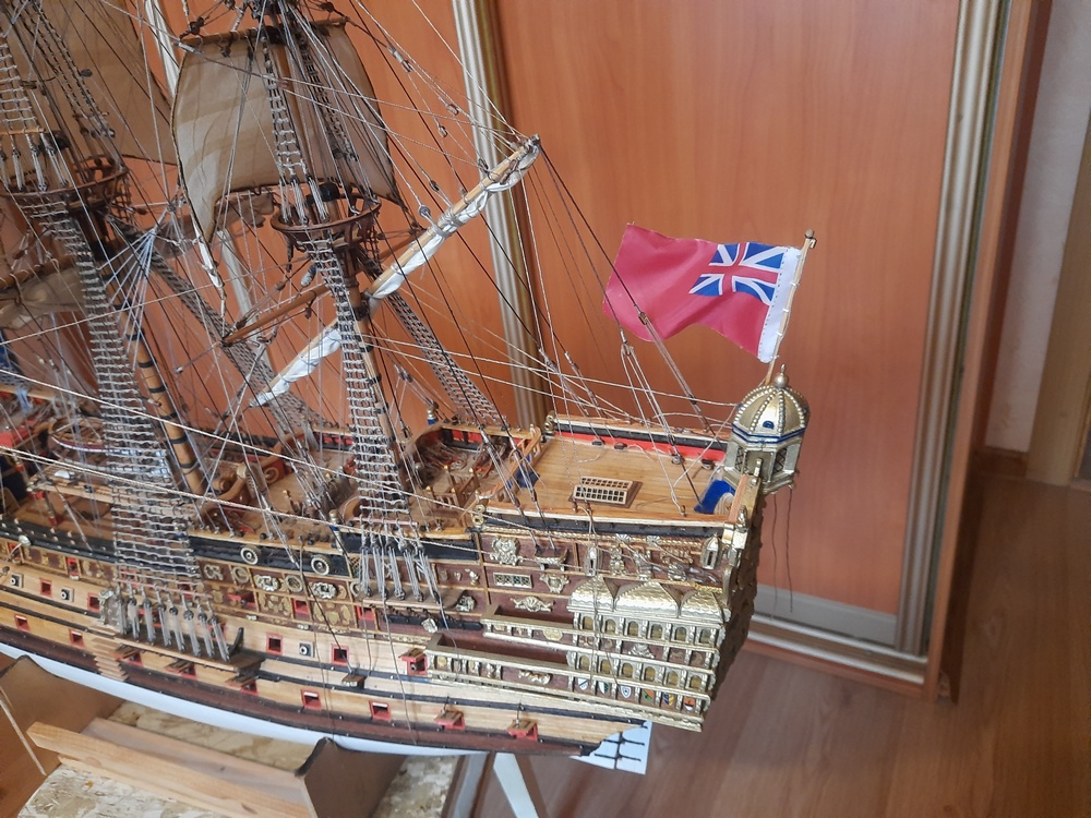 .Хочу показать вам флаги изготовленные по технологии о кот. я писал. При этом флаги на фок и грот мачтах из набора от ДеА, т.е. бумажные. Кормовой флаг из шёлка, он из моих запасов.По технологии изготовления бумажные флаги сложнее и требуют большего труда и старания. Флагов на гюйс и на бизань мачту у меня пока нет, вернее есть заготовки для изготовления. Будем работать дальше!