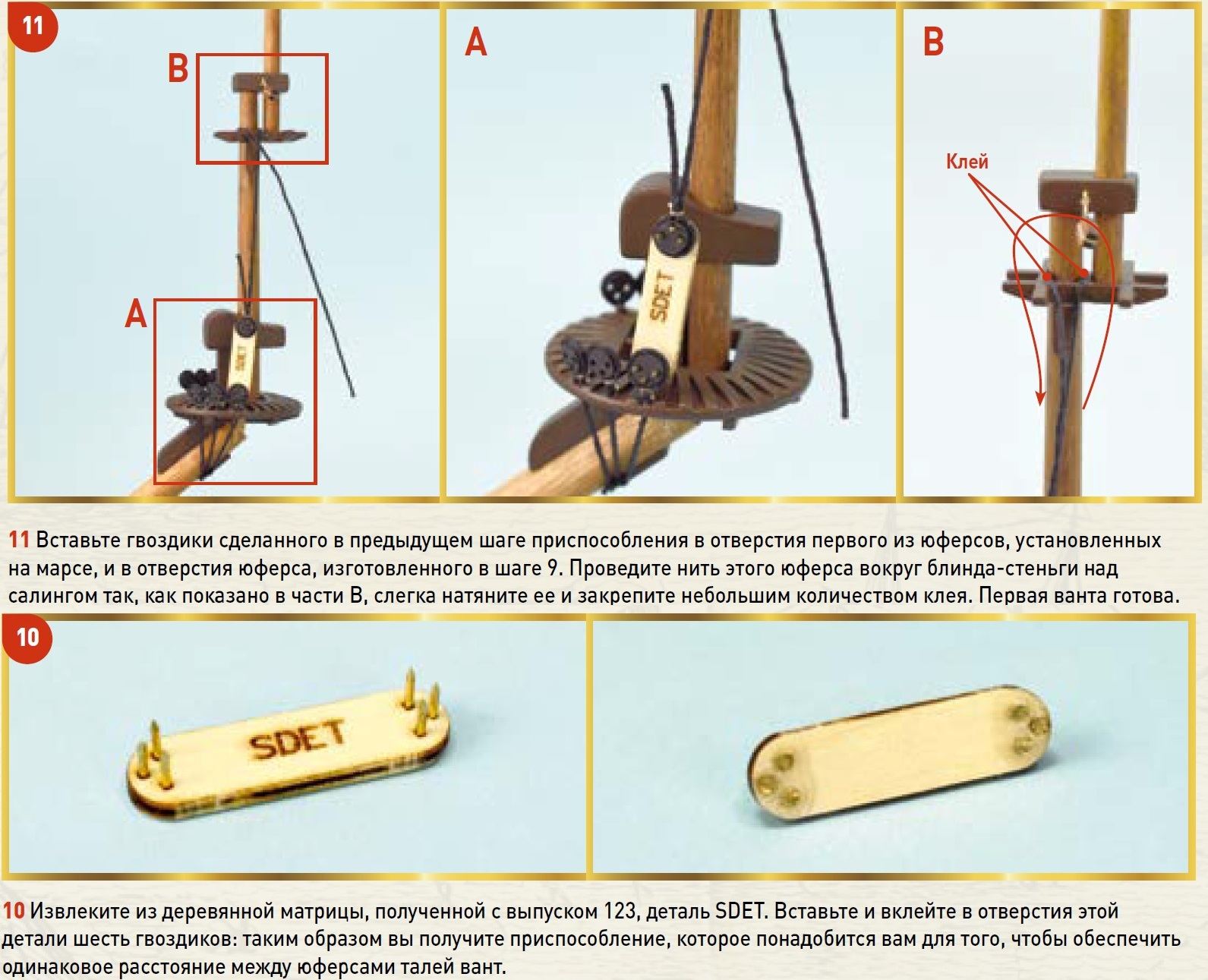 Зимой на ветке Sniper viewtopic.php?f=106&t=258&p=68722#p68722 обсуждались - способы выравнивания верхних юферсов на вантах. В журналах Солей Роял предлагается ещё один способ, на мой взгляд, он тоже жизнеспособен. Принцип прост - один шаблон на одну пару вант, ну да, думаю на фото всё понятно...