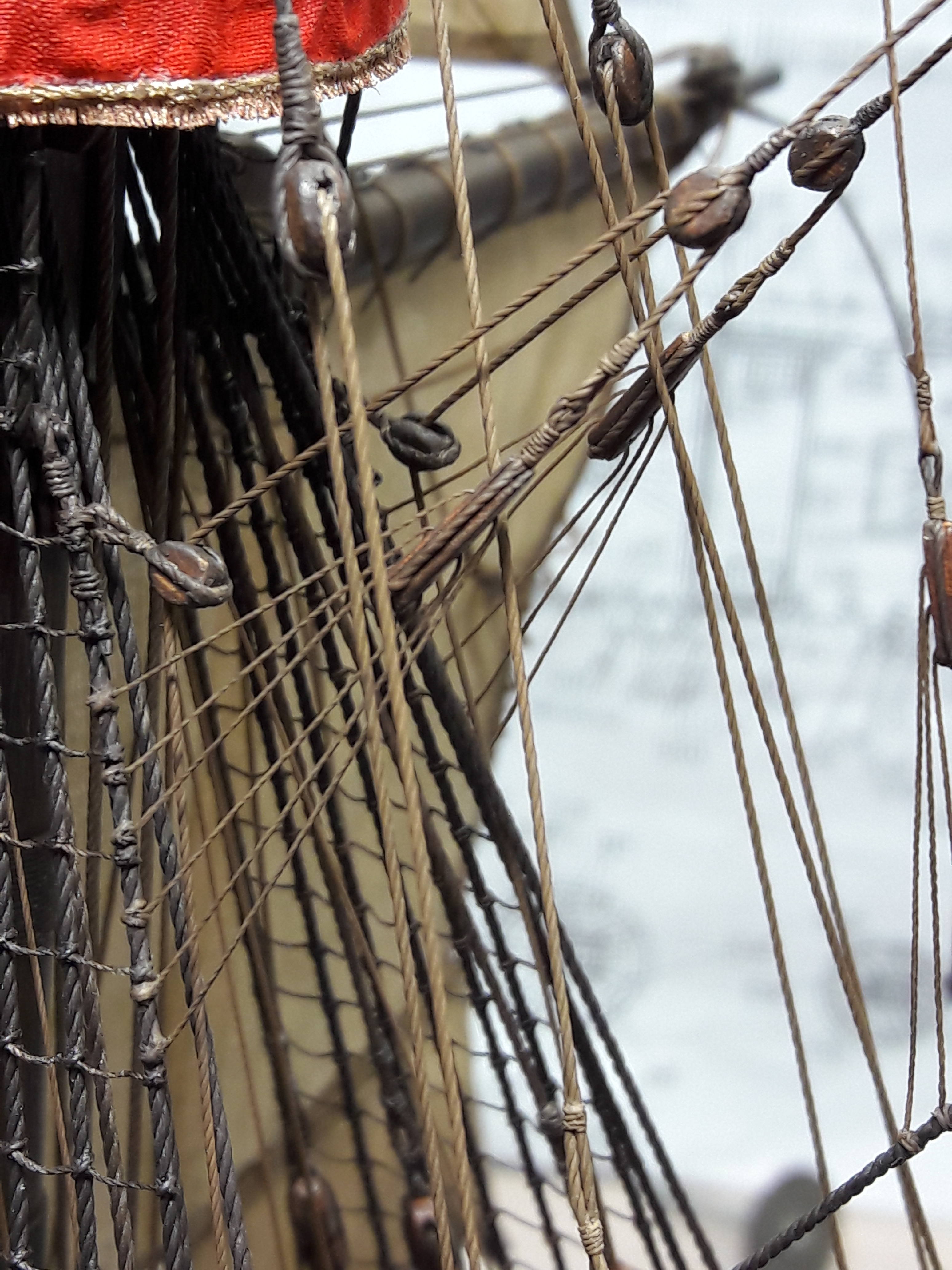 На второй вопрос я думаю правильный ответ: это имитация, обычная вещь в судомоделизме. Чертите в масштабе 1 : 1 весь узел на доске, вколачиваете гвоздики в местах соединений снастей, узлы снастей закрепляете цианом и весь узел аккуратно переносите на модель...