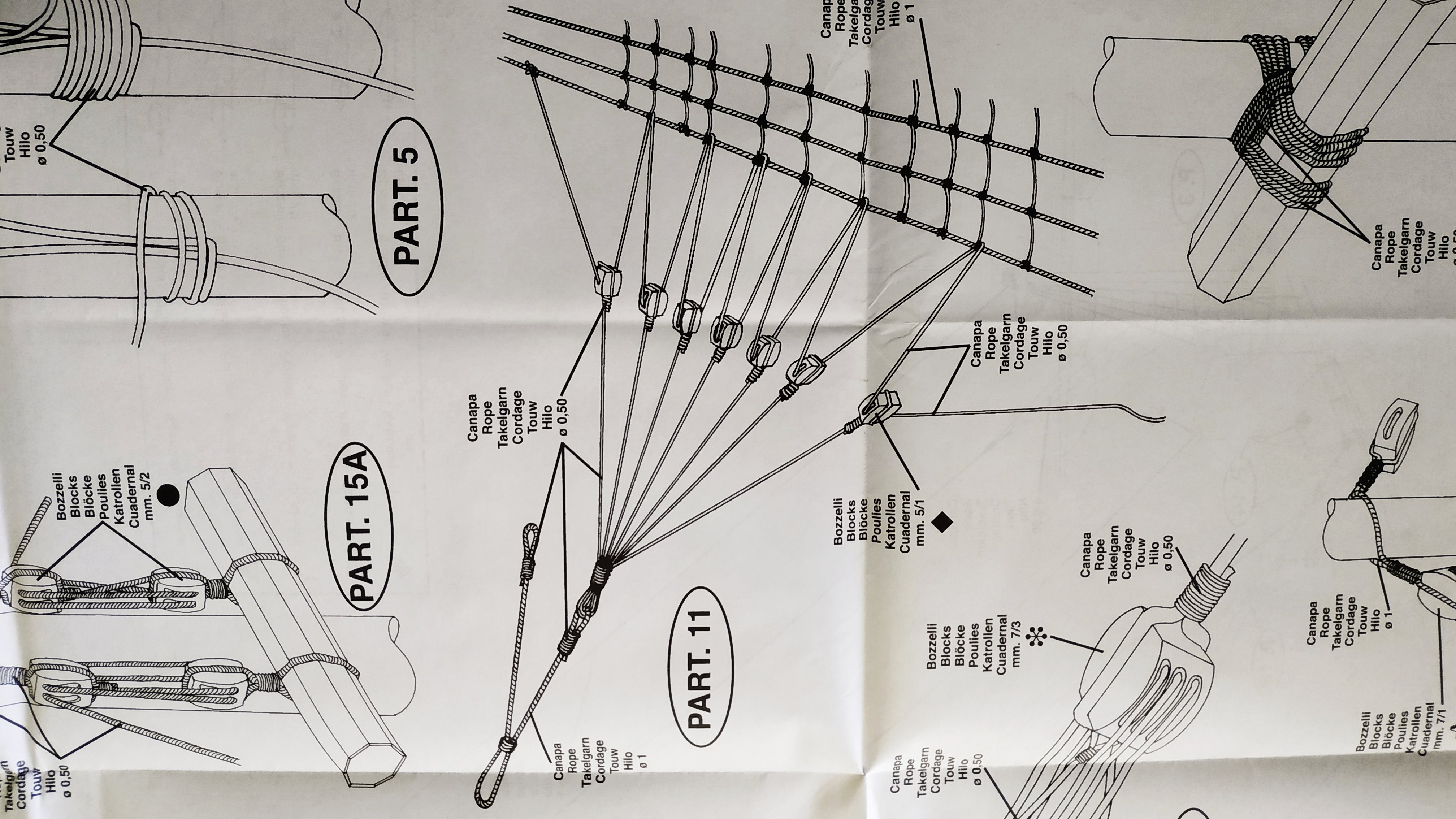 - Но все таки как натянуть такую снасть непонятно. Я пока ничего лучше не придумал, как расчертить в масштабе 1:1 для определения длины частей и идти сверху вниз, заканчивая узлами на ванте.