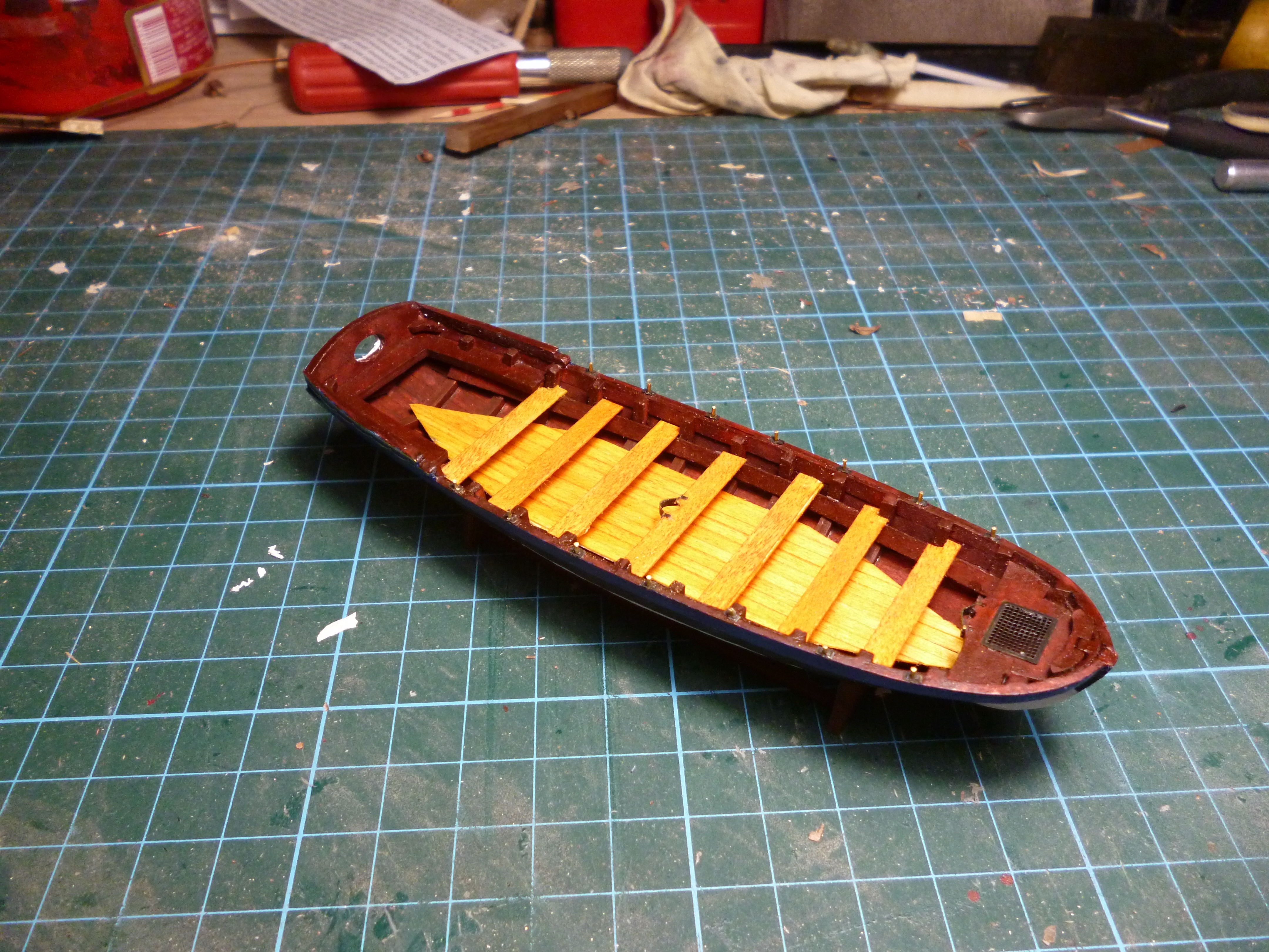 Ну и выложу памятник кривым рукам - первую шлюпку. Для покраски внутренней поверхности шлюпки смешал красную и черную краску. Для банок использовал материал чистовой обшивки. Морил морилкой клен.