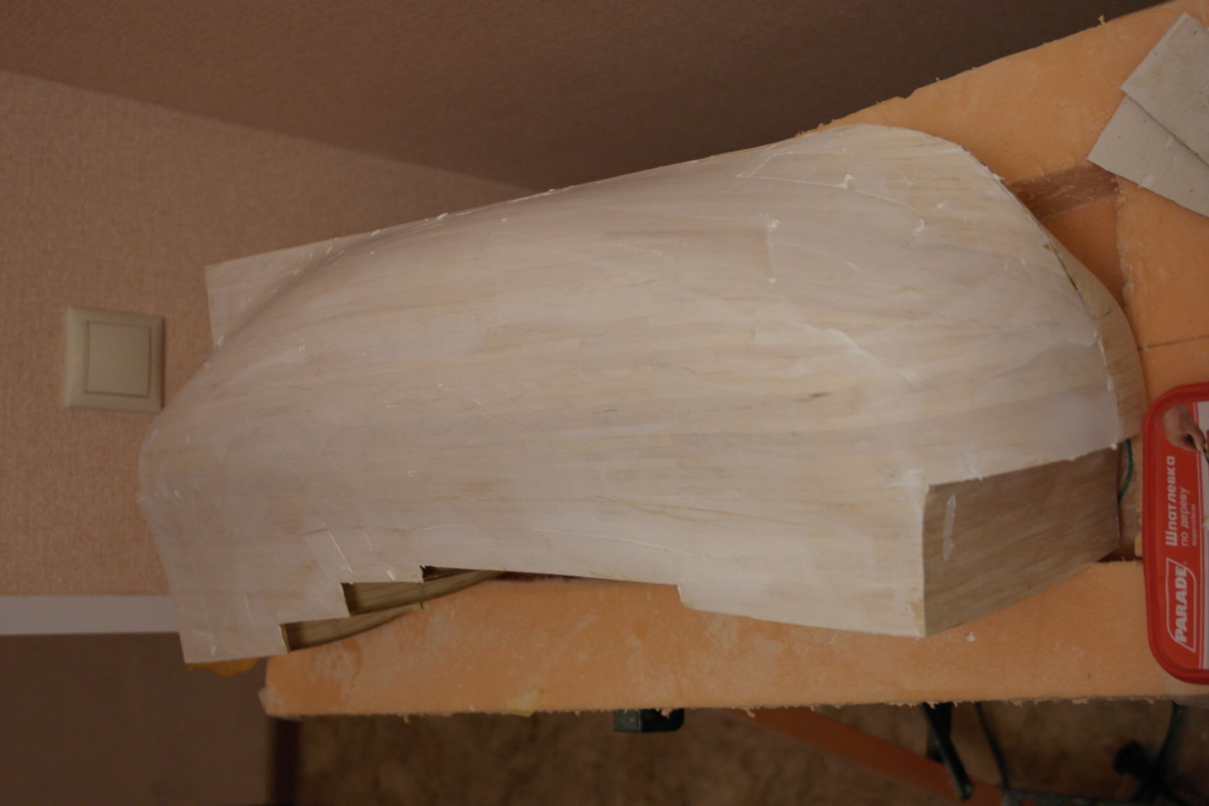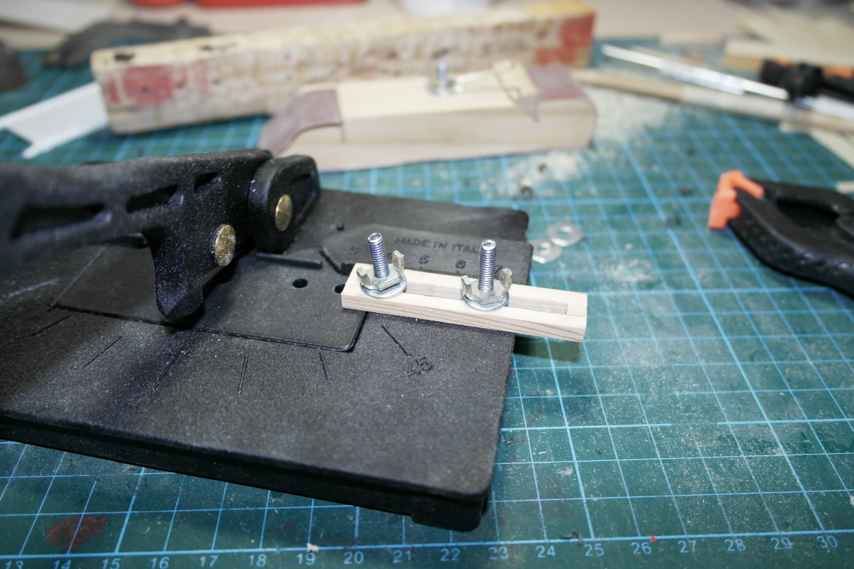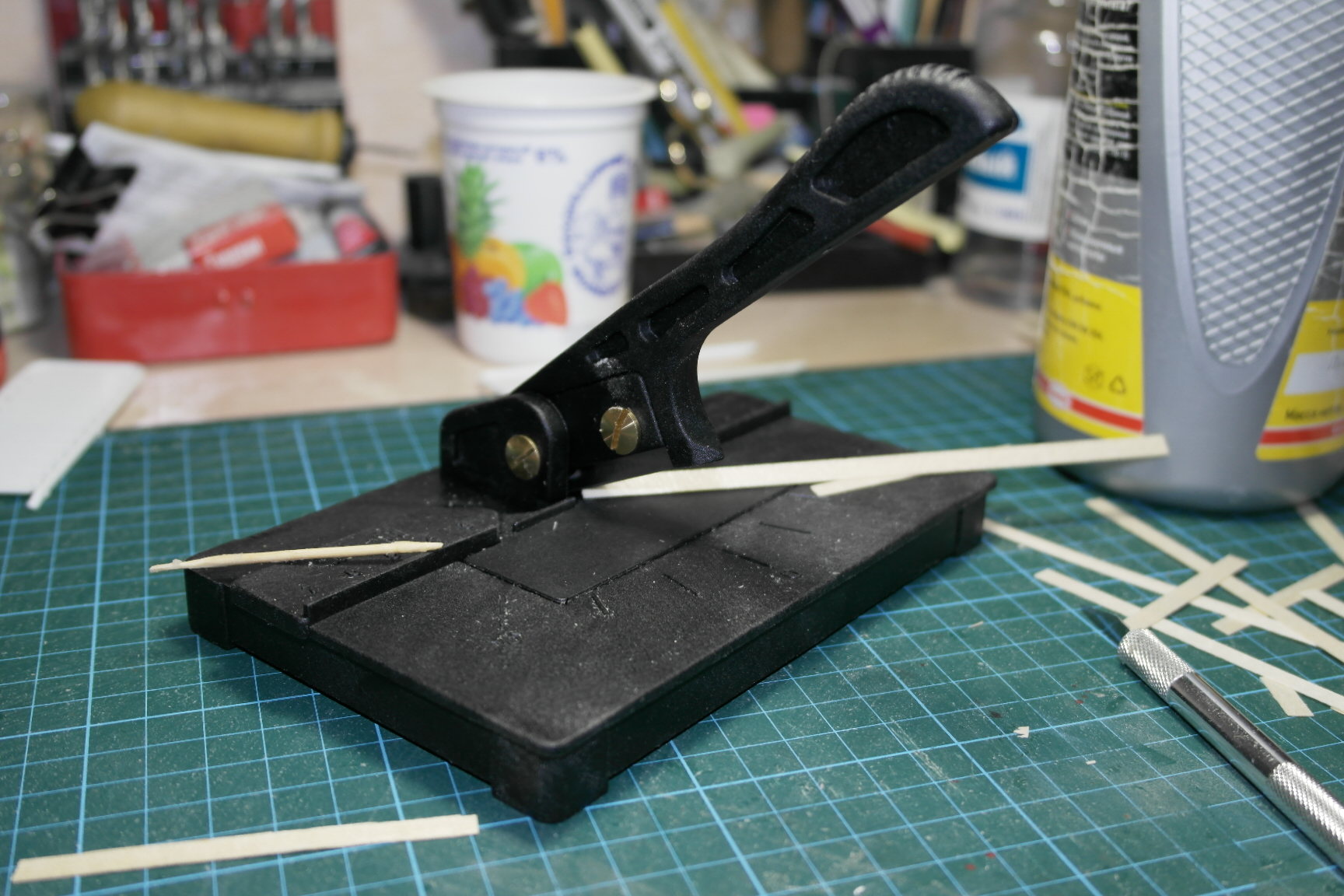 Продолжаем стройку. Перед началом чистовой обшивки решил приобрести приблуду, о которой задумывался еще на этапе изготовления палуб. Проблемно выдержать прямой угол и абсолютно одинаковую длину полосок шпона при резке ножом. Но тогда душила жаба ;) . Теперь вот решился