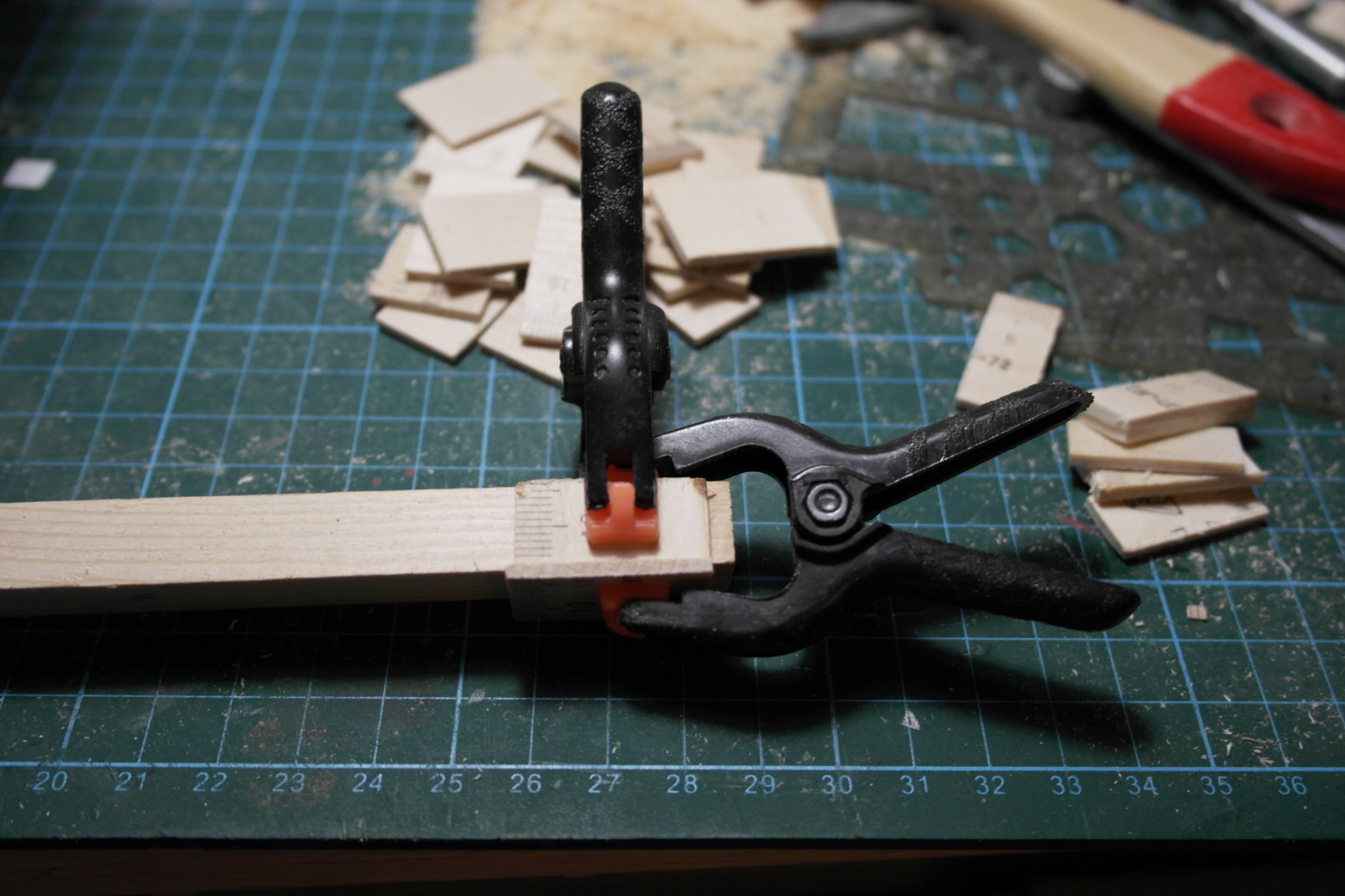 Теперь готовим рамки портов. Выпилил брусок квадратного сечения и напилил из линеек заготовок. Заготовки зажимаем пакетом в струбцину и наждачкой делаем в один размер, т.к. после циркулярки они все-таки немного отличаются.